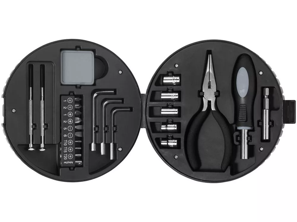 Набор из 25 инструментов включает измерительную мини рулетку, крестообразную отвертку, плоскую отвертку, 9 насадок с адаптером (4 крестообразных шлицев, 2 плоских шлица и 3 шестигранных шлица), 3 шестигранных ключа, 5 головок (5-9 мм), острогубцы, рукоятку отвертки, адаптер для насадок и удобный футляр. Тампопечать (1 цвет (цветные изделия)) на данный товар осуществляется бесплатно. Оплачивается только настройка оборудования в размере 8200 рублей на весь тираж.