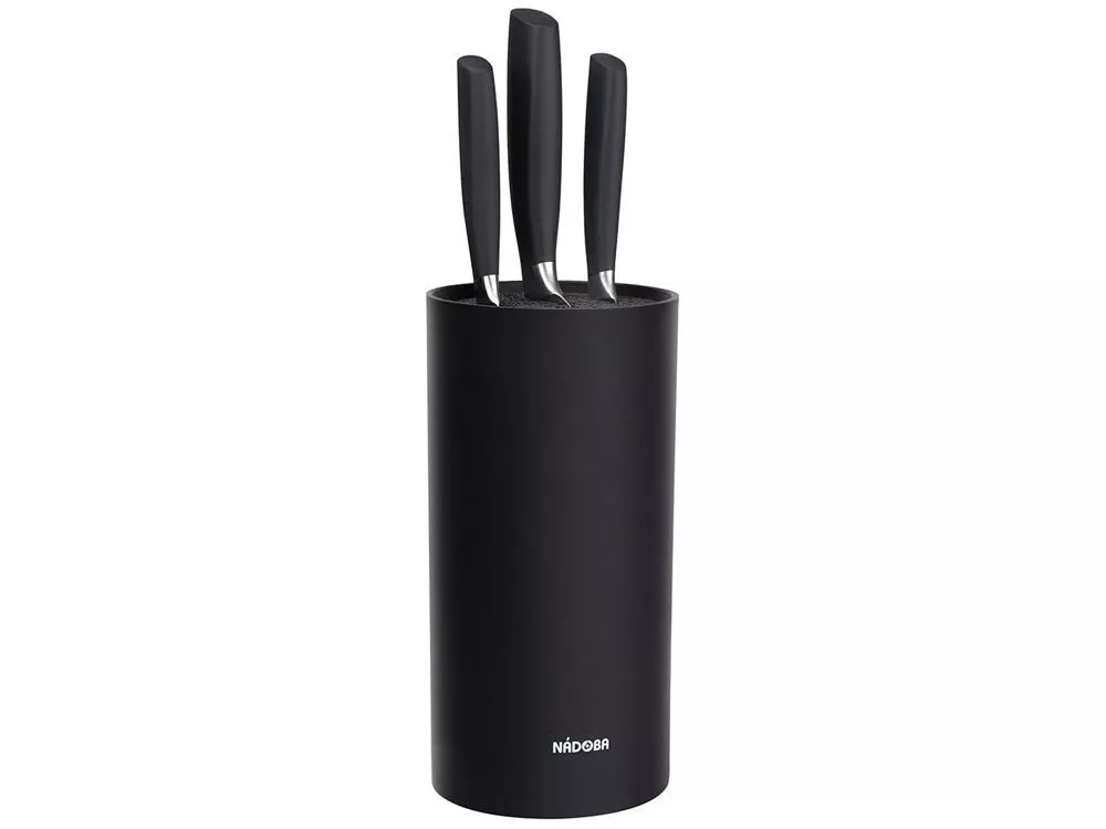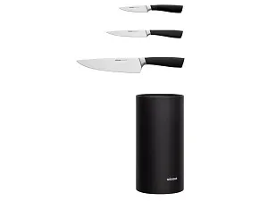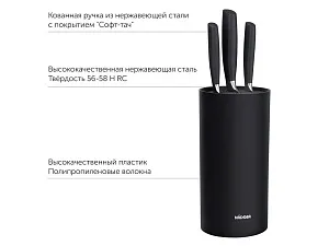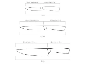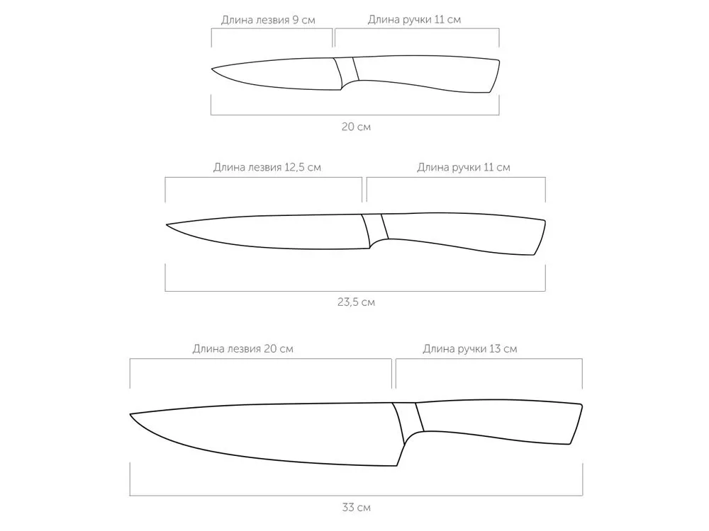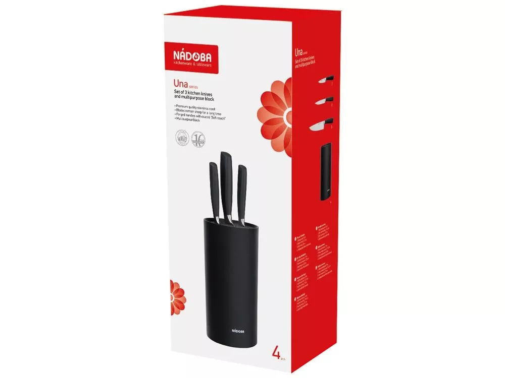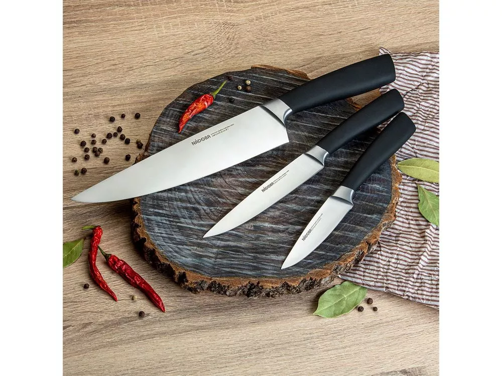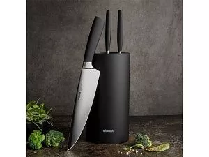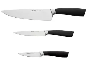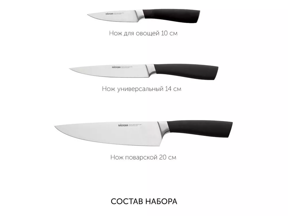 Набор из 3 кухонных ножей в универсальном блоке/ - Высококачественная нержавеющая сталь - Лезвие остаётся острым очень долгое время - Кованная ручка из нержавеющей стали с покрытием Софт-тач Комплектность: 1. Нож для овощей, 9 см 2. Нож универсальный, 12,5 см 3. Нож поварской, 20 см 4. Универсальный блок для ножей УФ-печать (УФ-печать цветные изделия) на данный товар осуществляется бесплатно. Оплачивается только настройка оборудования в размере 1800 рублей на весь тираж.