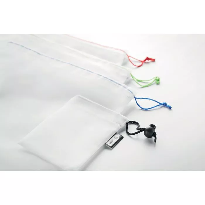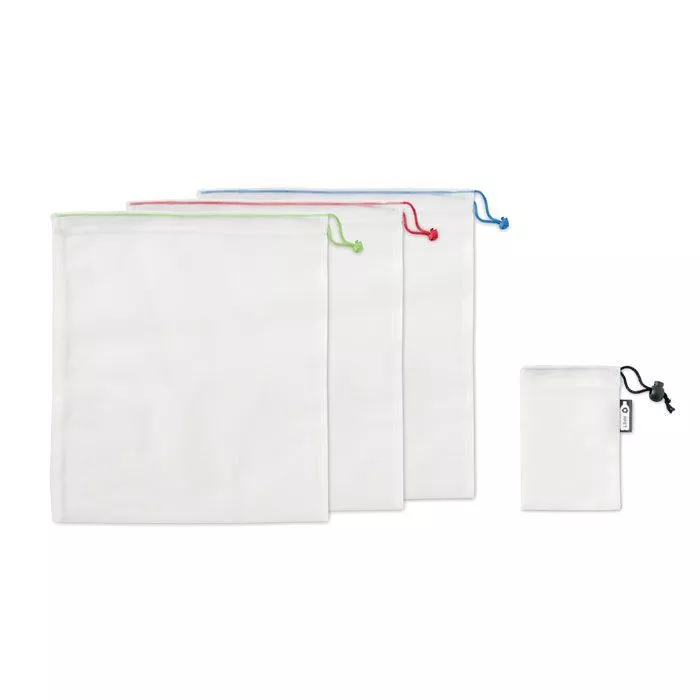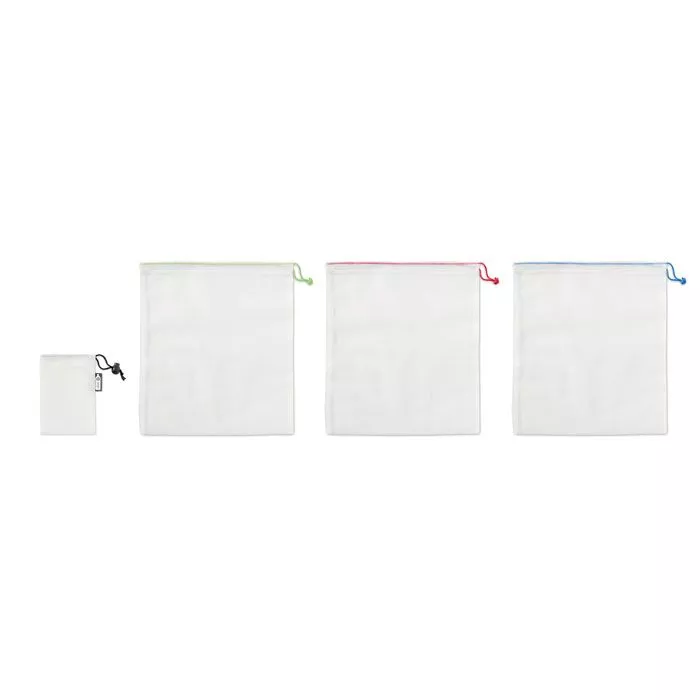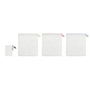 Набор из 3 сетчатых сумок из RPET . Закрывается кулиской. Можно стирать в стиральной машине. Не содержит BPA.