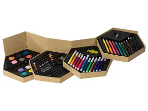 Набор из 52 предметов для рисования. 12 маркеров, 12 цветных карандашей, 12 восковых карандашей, 12 акварельных красок, кисточка, точилка, резинка и большая скрепка. Тампопечать (1 цвет (цветные изделия)) на данный товар осуществляется бесплатно. Оплачивается только настройка оборудования в размере 3600 рублей на весь тираж.
