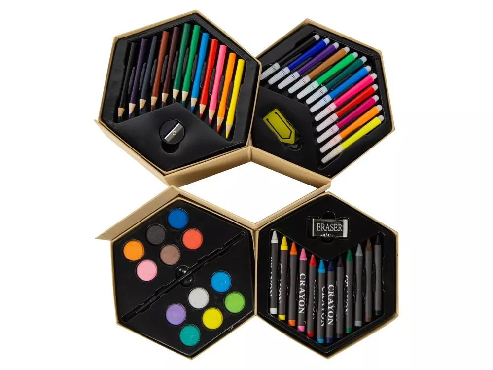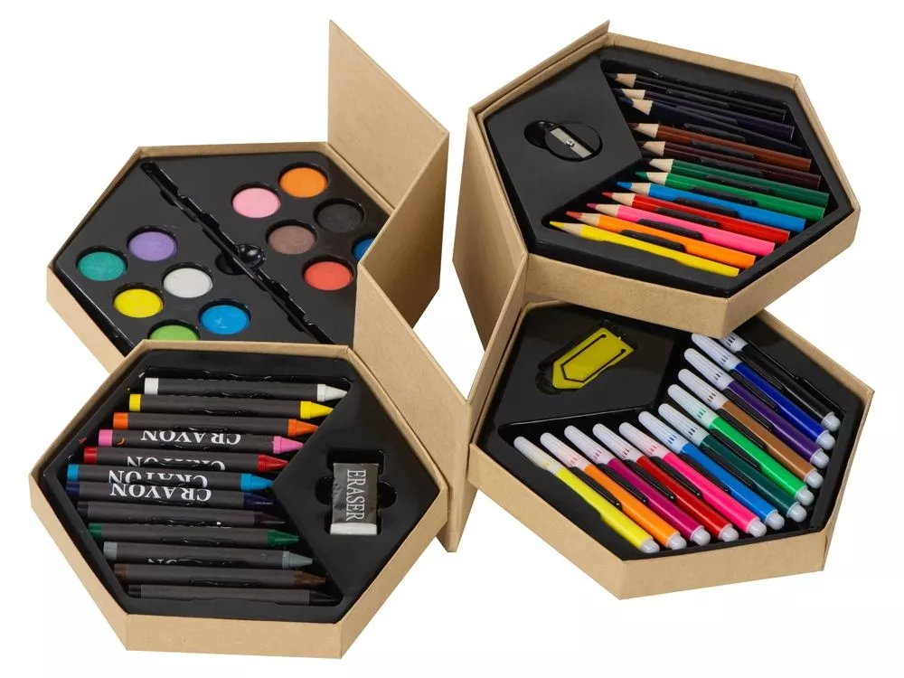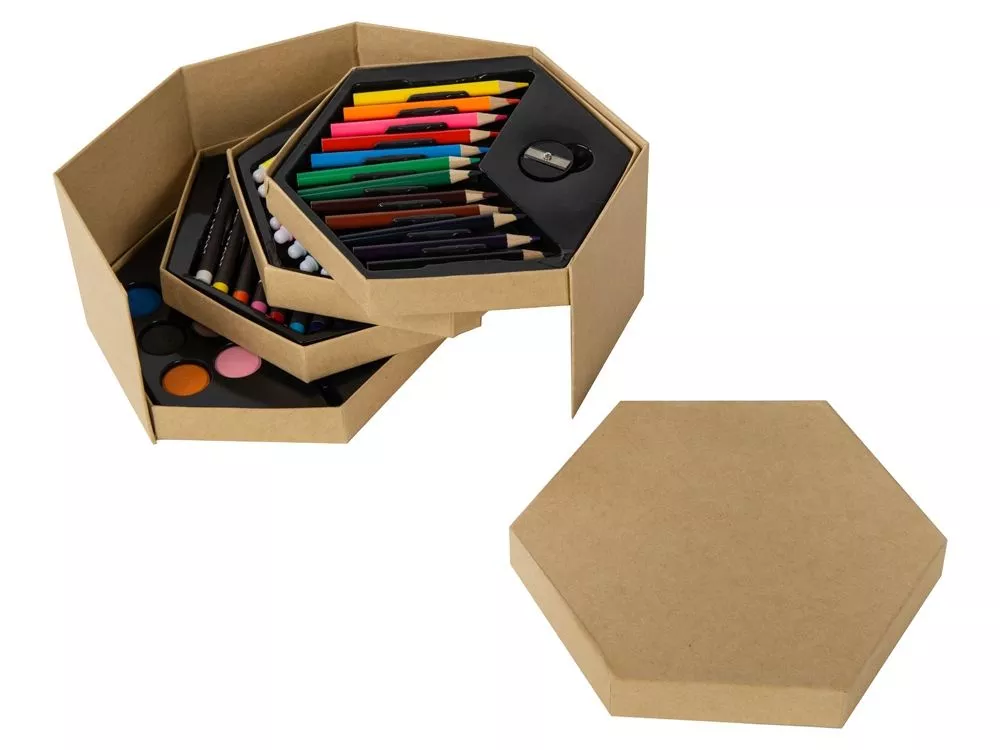 Набор из 52 предметов для рисования. 12 маркеров, 12 цветных карандашей, 12 восковых карандашей, 12 акварельных красок, кисточка, точилка, резинка и большая скрепка. Тампопечать (1 цвет (цветные изделия)) на данный товар осуществляется бесплатно. Оплачивается только настройка оборудования в размере 3600 рублей на весь тираж.