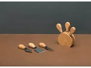 Набор состоит из ножей для сыра, подставки и удобной крафт-коробки. Кухонные инструменты выполнены из надежного каучукового дерева. Оно устойчиво к воздействию влаги, перепадам температуры и большим нагрузкам. Приборы устанавливаются в удобную деревянную подставку, где их можно хранить после использования. В комплект входят: - листовидный нож для твердых сортов сыра, - нож-лопатка для мягких сортов сыра, - вилка для сыра. Гравировка (CO2 лазер) (Без чернения) на данный товар осуществляется бесплатно. Оплачивается только настройка оборудования в размере 1000 рублей на весь тираж.