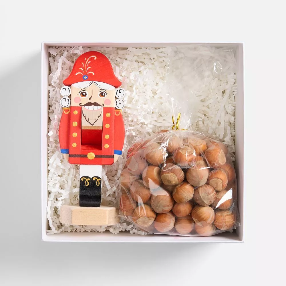 Могут ли чудеса случаться как по щелчку? Конечно! Праздничный набор позволит окунуться в сказочный мир детства. В аккуратной деревянной коробочке лежит настоящий орехокол — Щелкунчик, персонаж новогодней волшебной истории. С лесными орехами он справляется на раз.