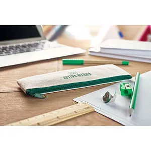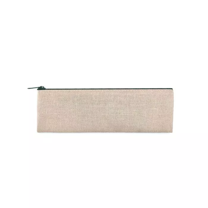 Канцелярский набор из 6 предметов, включающий пенал из джута и хлопка, линейку из бамбука, деревянную точилку, ластик, карандаш из бумаги и картонную шариковую ручку с синими чернилами.