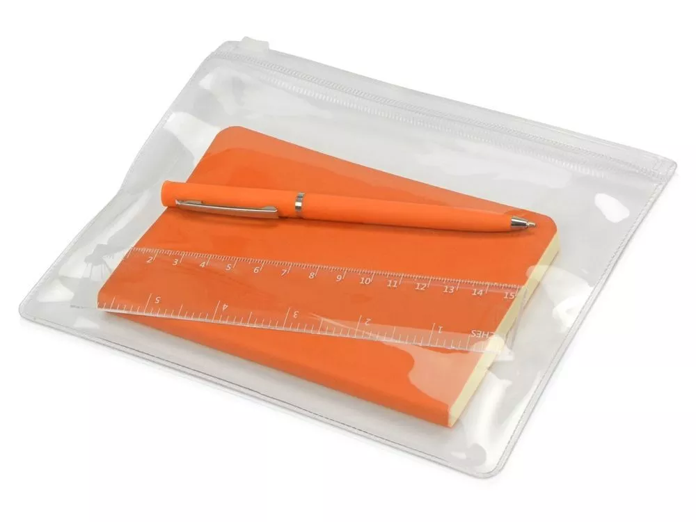 В канцелярский набор входит прозрачный пенал из ПВХ с zip-замком и линейка, блокнот формата А6 в мягкой обложке с закругленными углами, элегантная пластиковая ручка с хромированными деталями. Корпус ручки с приятным тактильным soft-touch покрытием. Тиснение (Блинт) на данный товар осуществляется бесплатно. Оплачивается только настройка оборудования в размере 5800 рублей на весь тираж.