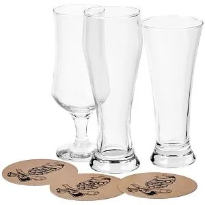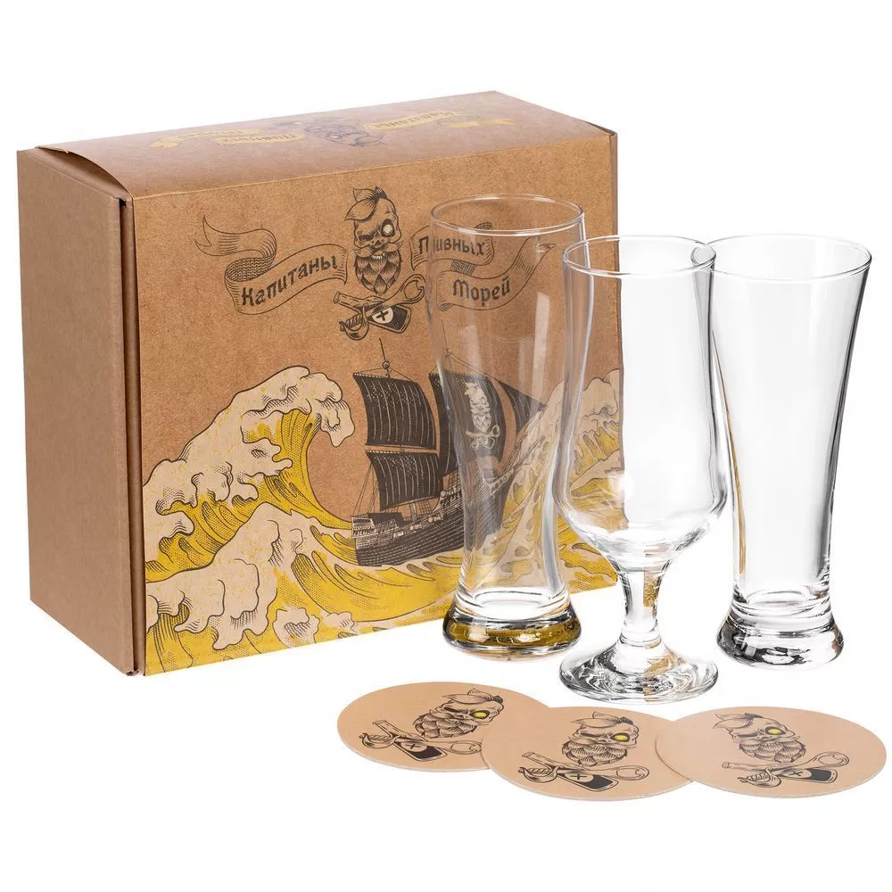 Три бокала разных форм, чтобы максимально раскрыть особенности выбранных сортов пива, костеры с брутальным принтом, соленая закуска из вяленого мяса курицы и открывашка — свистать всех наверх и пусть пива будет целое море!