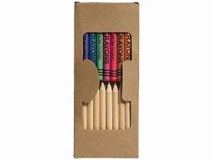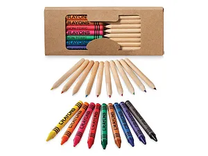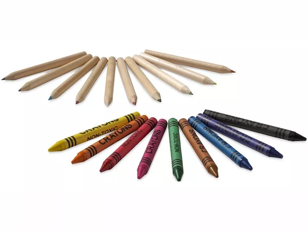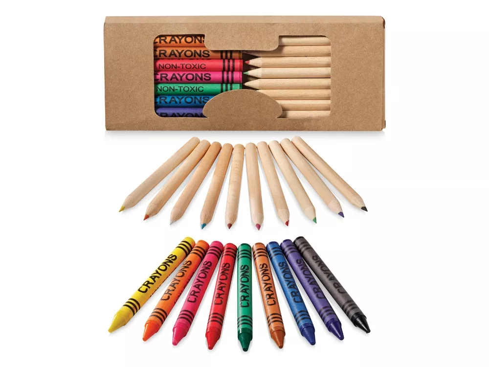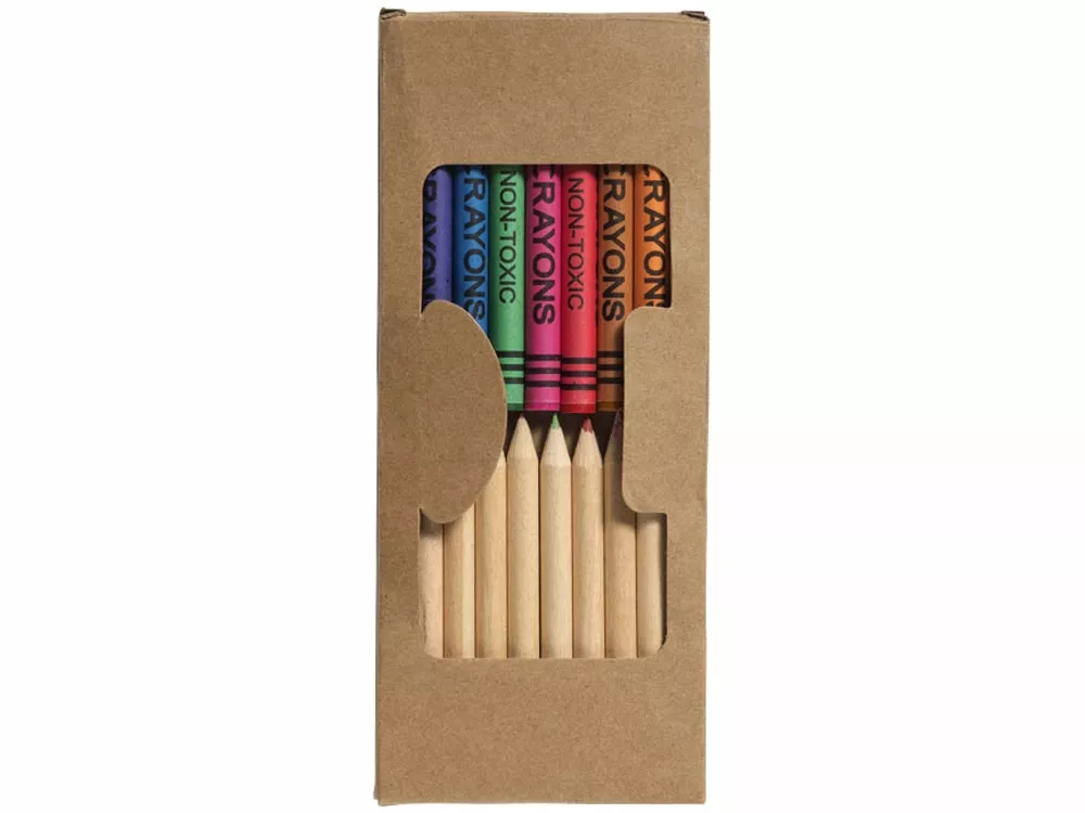 Набор из 19 карандашей. 9 цветных восковых карандашей и 10 цветных карандашей в картонной коробке с пластиковым окошком. Нанесение не предлагается на отдельные элементы набора. Картон.
