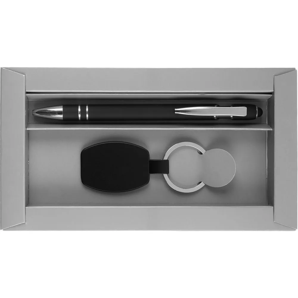 Стильное решение для простого делового подарка — гравировка на брелке вскрывается серебристым, в тон хромированным деталям на ручке.