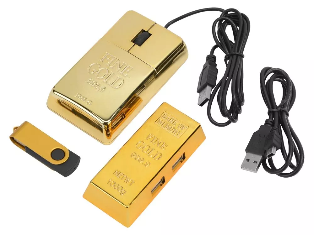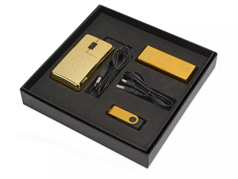 Набор компьютерных аксессуаров, в который входят: компьютерная мышка, USB Hub на 4 порта, изготовленные в виде золотых слитков, а также флеш-карта USB 2.0 на 8 Gb и кабель mini-USB. Это отличный подарок со смыслом, ведь золотой слиток – это символ богатства и роскоши!