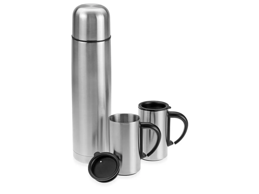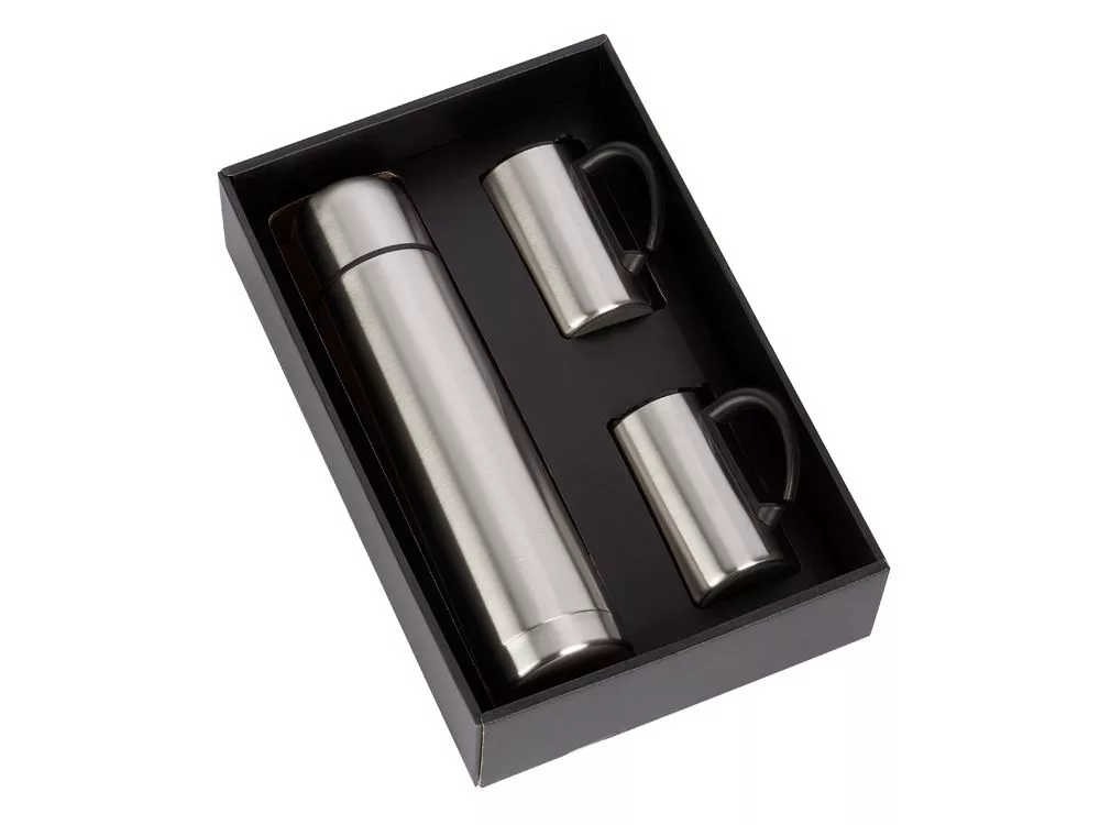 Отличный набор, состоящий из термоса на 1000 мл и двух термокружек на 300 мл, пригодится и в дороге, и во время пикника или похода. Нержавеющая сталь не впитывает запахи и отлично удерживает тепло более 24 часов. Термокружки идут со специальными пластиковыми крышками. Упакован в картонную коробку с мягким поролоновым ложементом. Гравировка (оптоволоконный лазер) (Без чернения) на данный товар осуществляется бесплатно. Оплачивается только настройка оборудования в размере 1000 рублей на весь тираж.