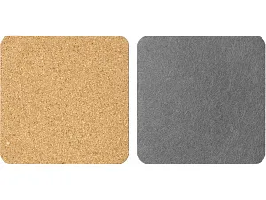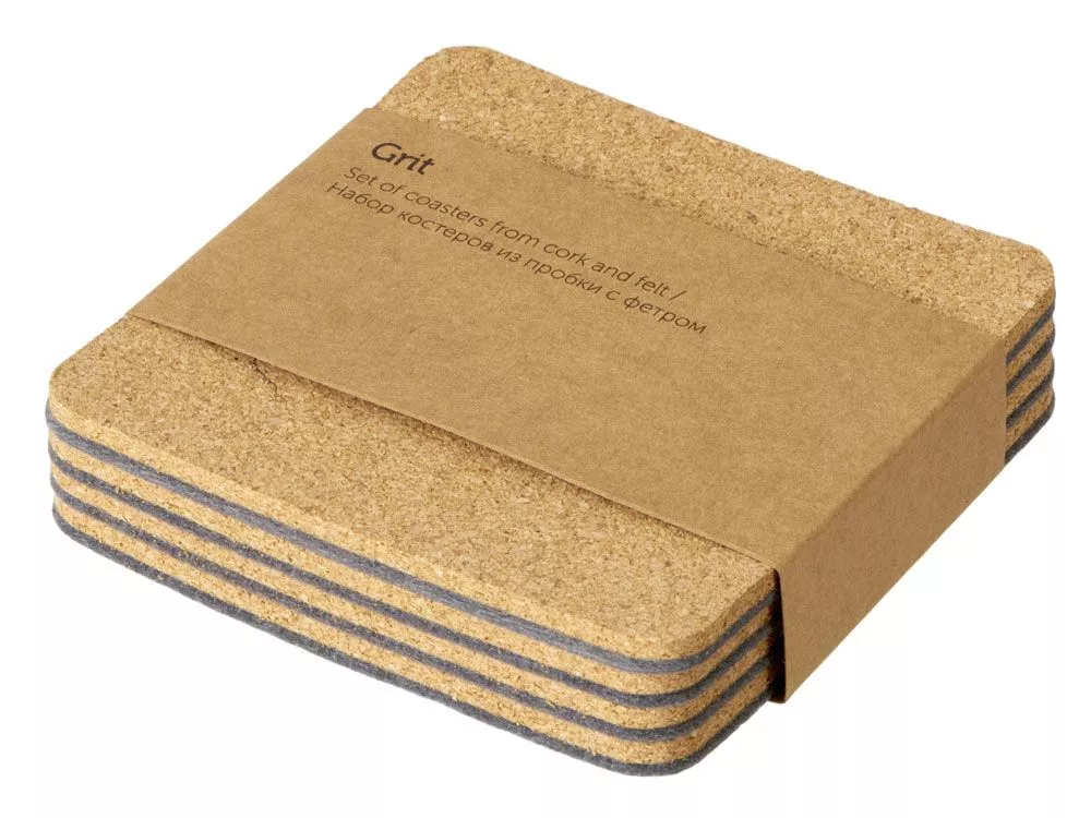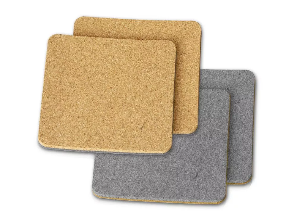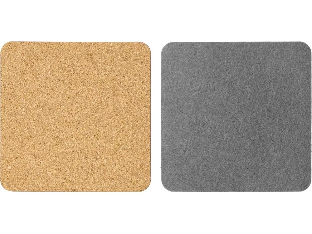 Четыре квадратных костера, выполненных из фетра и пробки. Благодаря выбору материалов посадка стаканов — мягкая и бесшумная: и пробка, и фетр заглушают звук, безопасны и для посуды, и для поверхности стола, защищая от механических повреждений и загрязнения. - интересное сочетание материалов - для защиты поверхности стола и предотвращения сколов дна посуды - 4 штуки в комплекте - двустороннее использование Не рекомендуется использовать в посудомойке. Гравировка (CO2 лазер) (Без чернения) на данный товар осуществляется бесплатно. Оплачивается только настройка оборудования в размере 1000 рублей на весь тираж.