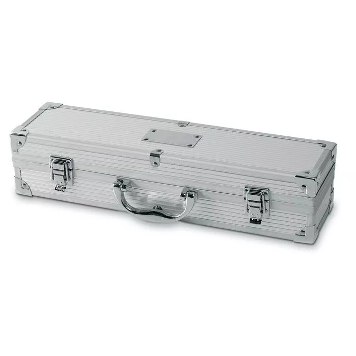 Алюминиевый чемоданчик с 3 приборами из нержавеющей стали для барбекю. Для нанесения логотипа предлагается специальная пластина.