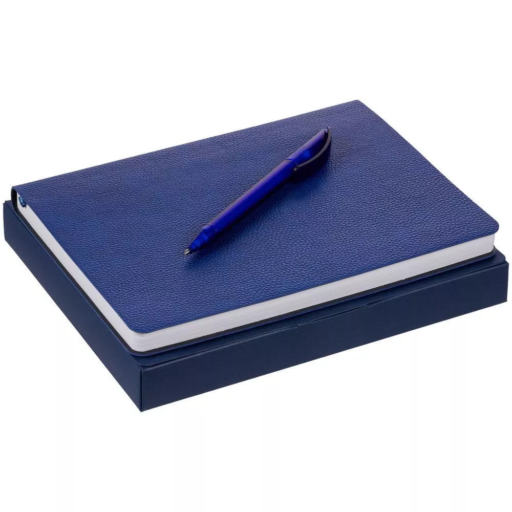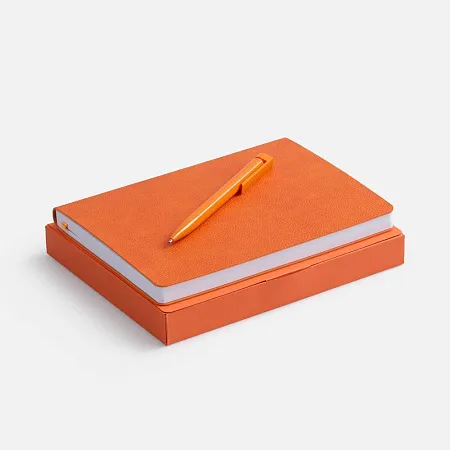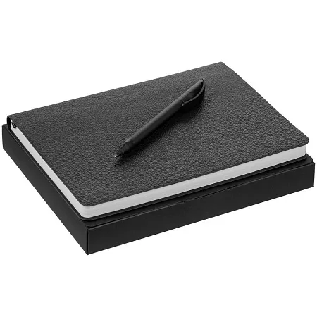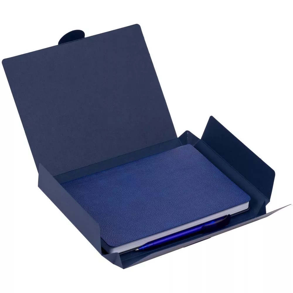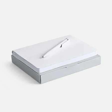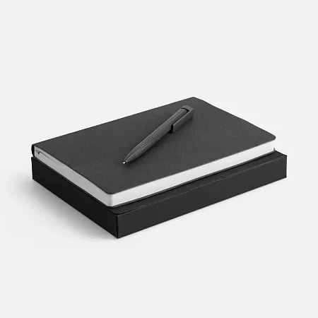 Недатированный ежедневник с гибкой обложкой из фактурного материала La Fite и металлическим шильдом на ляссе и ручка в тон, упакованный в подарочную коробку из дизайнерского картона.