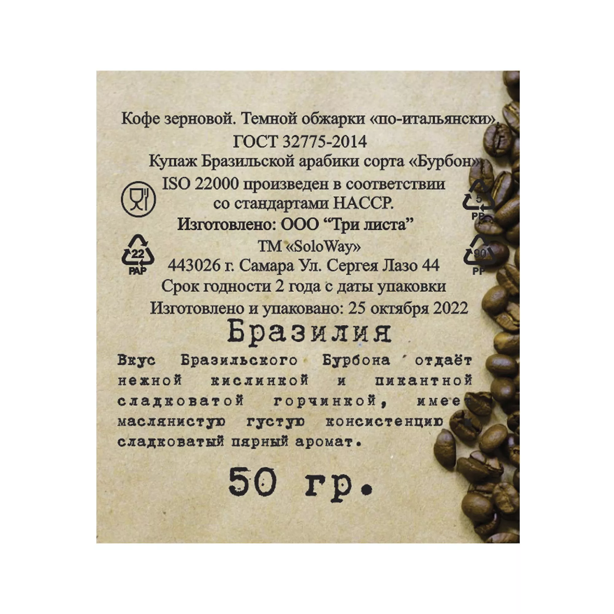 - кофе зерновой (100% арабика) 50 гр;