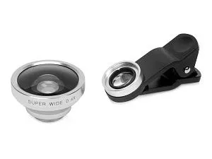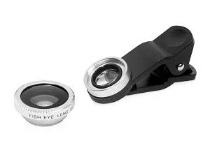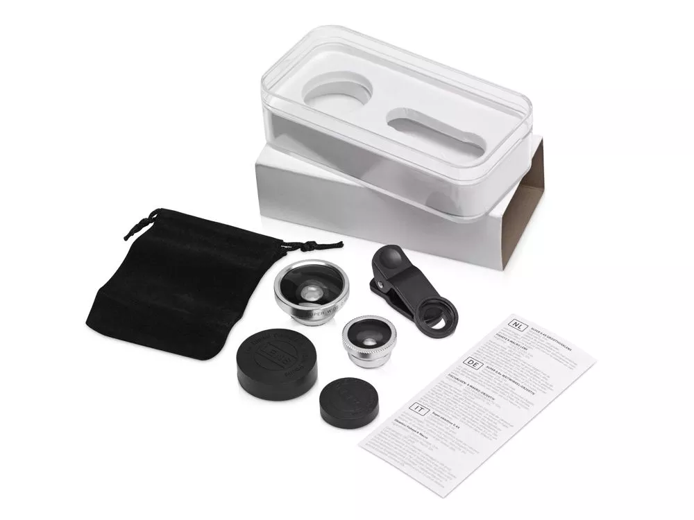 Универсальный набор из 3 линз (объективов) для смартфона. Подходит как для внешних, так и для камер селфи. В наборе: широкоугольный объектив (0,4 х), объектив рыбий глаз (180°) разбирается на 2 части, одна из них - объектив для макросъёмки, зажим-прищепка для крепления объективов, инструкция, пластиковый бокс, защитные крышки для объективов, мягкий чехол. Тампопечать (1 цвет (цветные изделия)) на данный товар осуществляется бесплатно. Оплачивается только настройка оборудования в размере 2300 рублей на весь тираж.