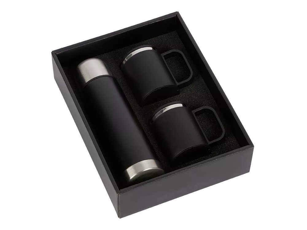 Термос на 500 мл и две термокружки на 200 мл из нержавеющей стали сверху декорированы пластиком, который не даст вашим рукам обжечься. Термос сохранит ваши напитки горячими более 6 часов. Термокружки держат тепло до 2 часов. На термос и кружки можно нанести логотип. Гравировка (CO2 лазер) (Без чернения) на данный товар осуществляется бесплатно. Оплачивается только настройка оборудования в размере 1000 рублей на весь тираж.