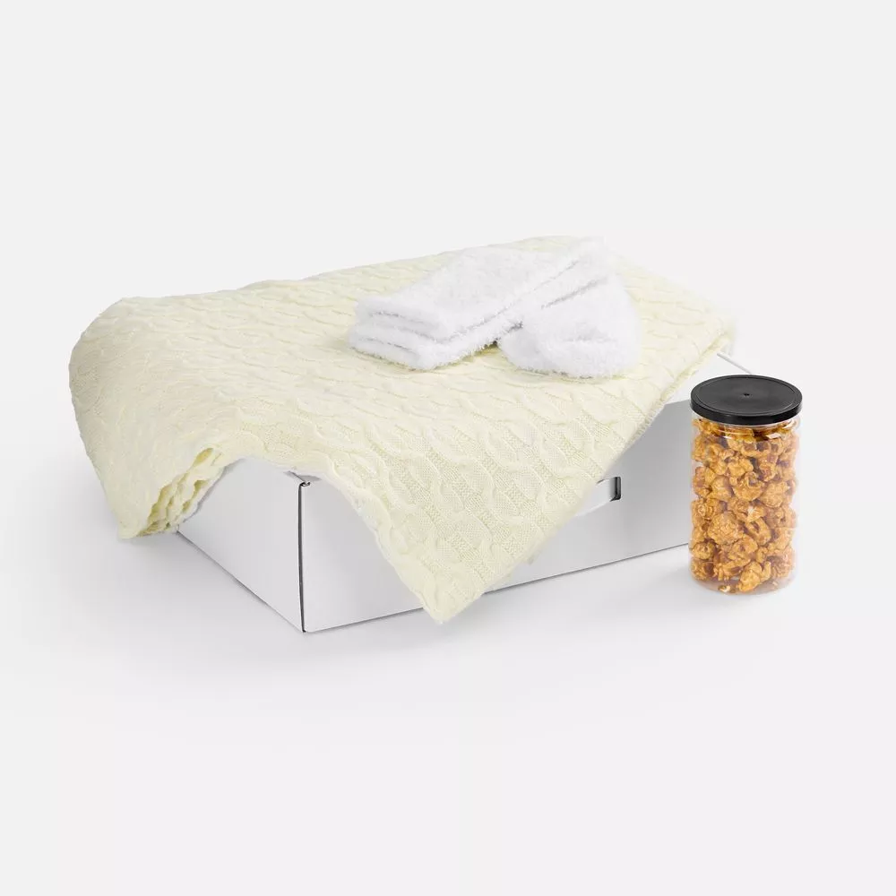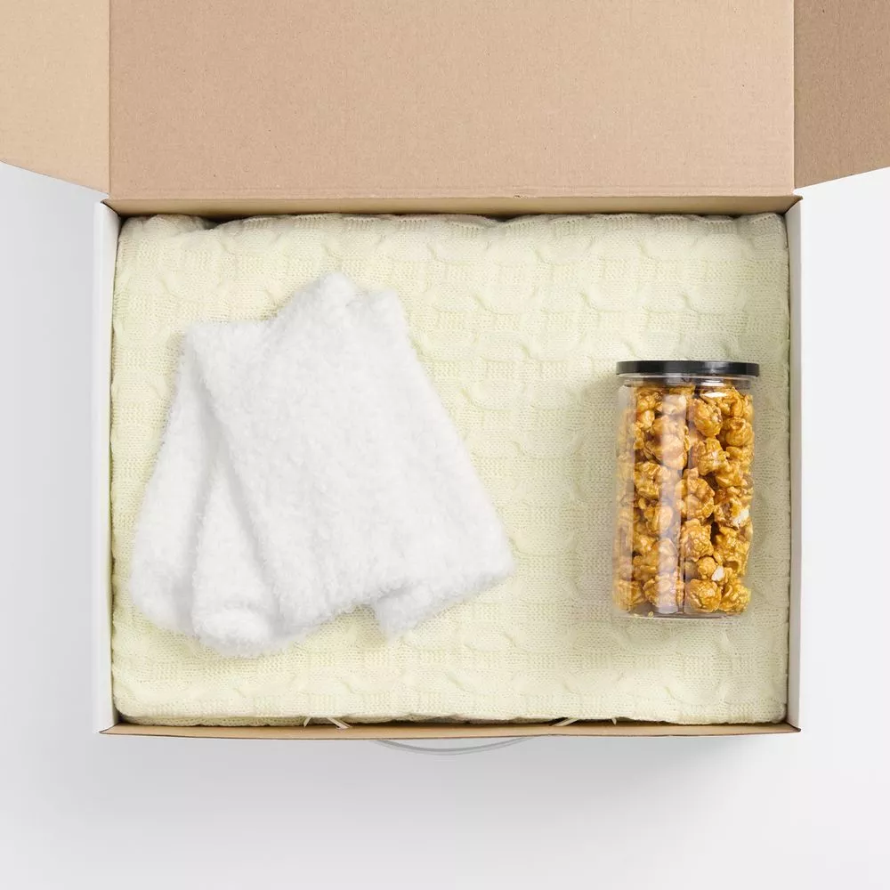 Нотка хрустящего удовольствия в сладком попкорне, обволакивающее тепло пледа с геометрическим узором и мягких пушистых носков — идеальное комбо для уютного вечера и великолепного времяпрепровождения.