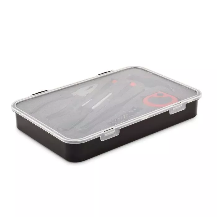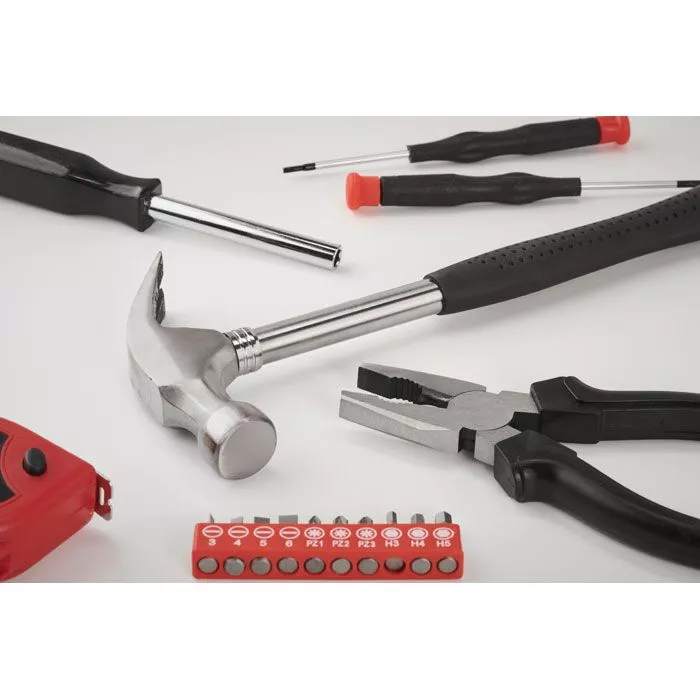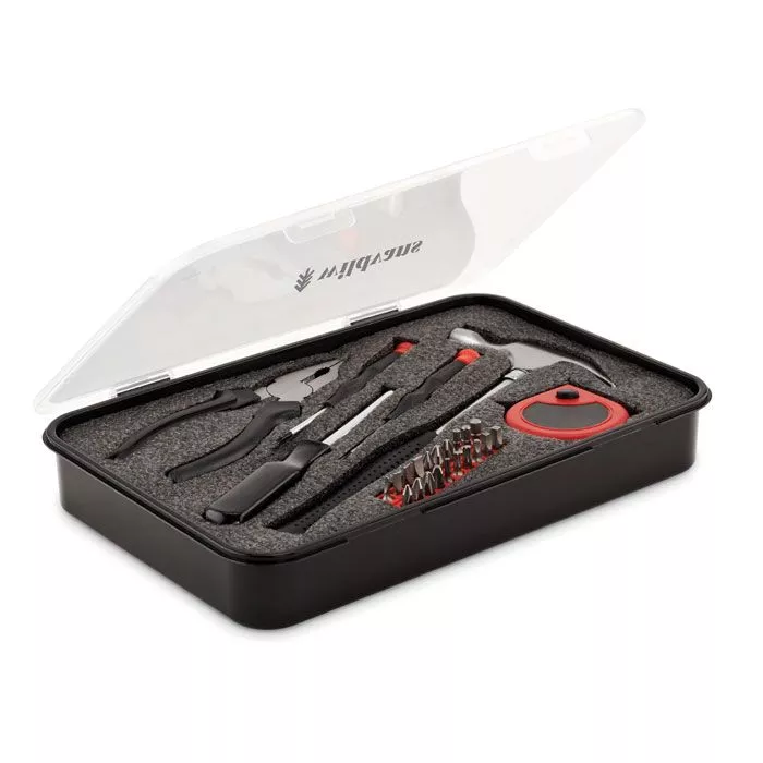 Набор инструментов из 25 предметов в полипропиленовой коробке, включая молоток, рулетку, комбинированные пиллерсы, 20 бит, держатель для бит и 2 прецизионные отвертки.