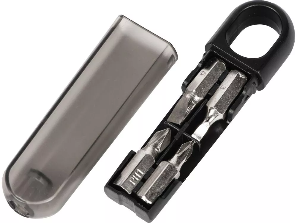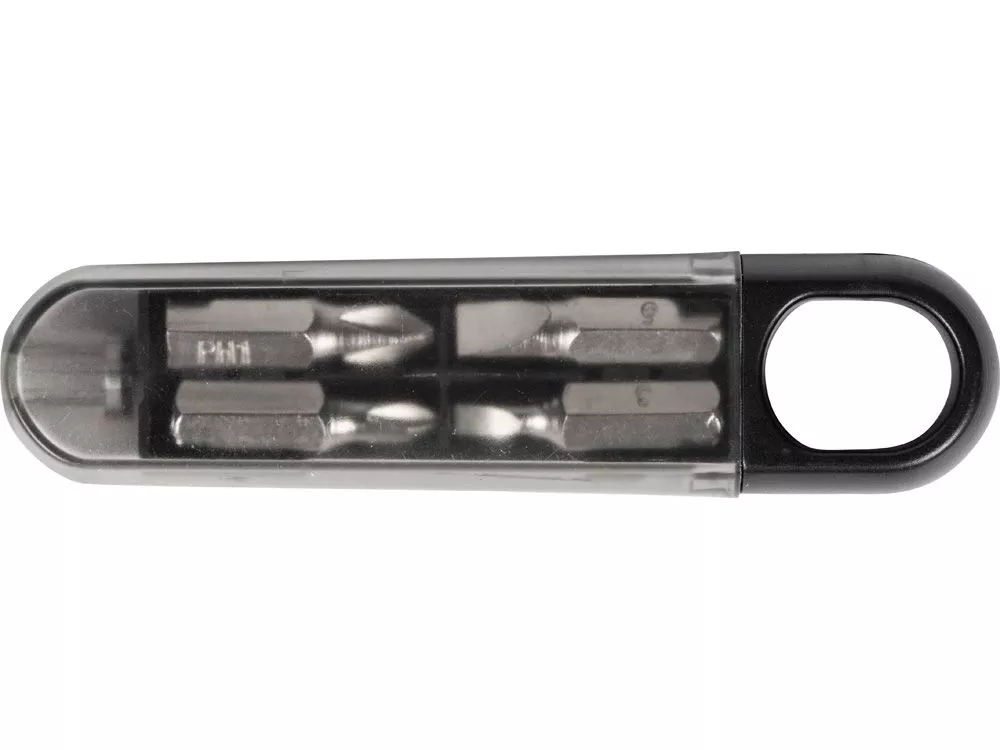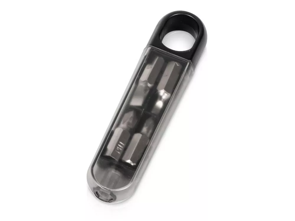 Набор отверток состоит из 4 бит (две крестовые, две поперечные разного размера), которые подсоединяются к ручке-кейсу. Благодаря прозрачной крышке все биты видны, даже когда кейс закрыт, что помогает держать их количество под контролем. • ручка-кейс с отверстием для подвешивания • прозрачная крышка не даст потерять биты • 4 биты Тампопечать (1 цвет (цветные изделия)) на данный товар осуществляется бесплатно. Оплачивается только настройка оборудования в размере 4000 рублей на весь тираж.
