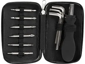 Этот компактный набор содержит 15 инструментов: 3 шестигранных ключа, 6 двухсторонних насадок с битами и ручки к ним. Весь набор компактно упакован в футляр с фиксирующими резинками, которые удерживают инструменты на створках. • 3 шестигранных ключа, 6 двухсторонних насадок с битами и ручки к ним • компактный футляр с удобной организацией пространства внутри • металлические компоненты выполнены из нержавеющей стали Гравировка (оптоволоконный лазер) (Без чернения) на данный товар осуществляется бесплатно. Оплачивается только настройка оборудования в размере 1100 рублей на весь тираж.