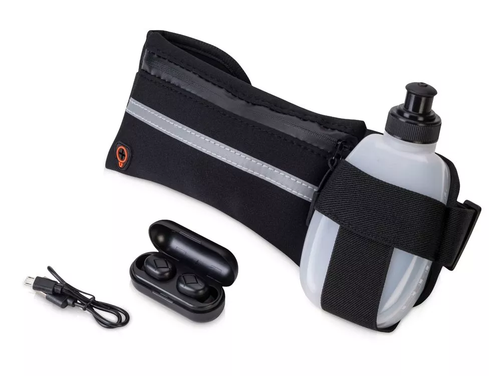Спортивный набор для комфортных тренировок в удовольствие. Компактная, легкая и удобная сумка без проблем садится на людей с разным объемом талии благодаря регулируемому, эластичному ремню. В комплекте — небольшая бутылочка с удобной поилкой, которая поможет вам перевести дух во время спринта. Бутылочка крепится к сумке специальной резинкой. Беспроводные стерео наушники, выполненные в классическом дизайне, позволяют слушать любимую музыку даже во время выполнения упражнений. Внутриканальная конструкция наушников помогает надёжно зафиксировать их в ушной раковине, не допуская случайного выпадания. Радиус действия сигнала 10 метров, время работы на одном заряде 3 часа. Наушники обладают высокой пыле- и влагозащитой степени IP54. - объём бутылочки: 270 мл; - светоотражающий элемент на сумке; - зарядка кейса наушников всего 1 час! - в комплекте к наушникам кабель Micro-USB, сменные амбушюры и инструкция. Термотрансфер (1 цвет (цветные изделия)) на данный товар осуществляется бесплатно. Оплачивается только настройка оборудования в размере 10000 рублей на весь тираж.