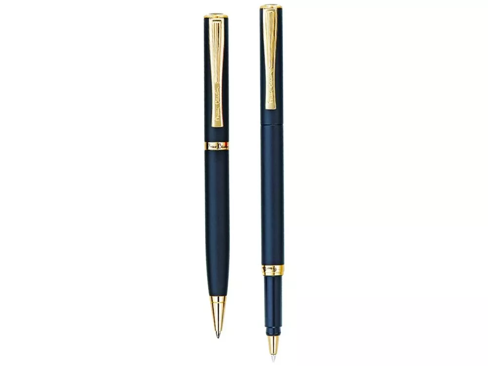 Набор: ручка шариковая с поворотным механизмом и ручка-роллер с колпачком. Ручка шариковая с матовым лаковым покрытием, комплектуется одним синим стержнем. ручка-роллер с матовым лаковым покрытием, комплектуется одним синим стержнем.