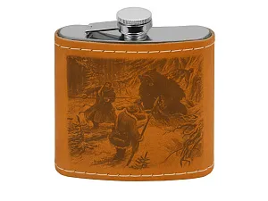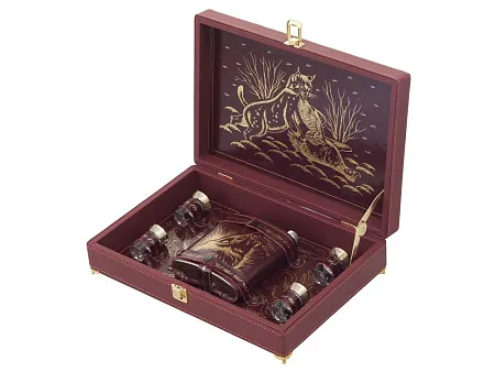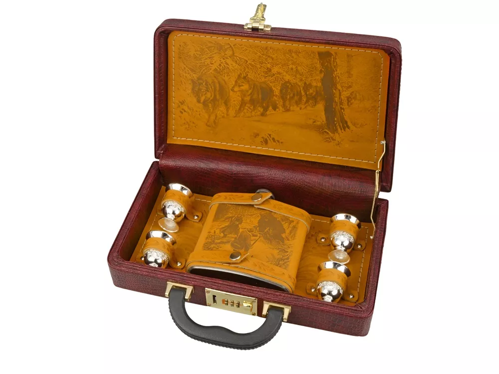 Кейс из сплит-кожи, с повышенной износостойкостью, внутренняя отделка натуральная кожа с художественным выжиганием. В комплекте: Стопка 40мл (нейзильбер)- 4 шт. Фляга 500мл- 1шт