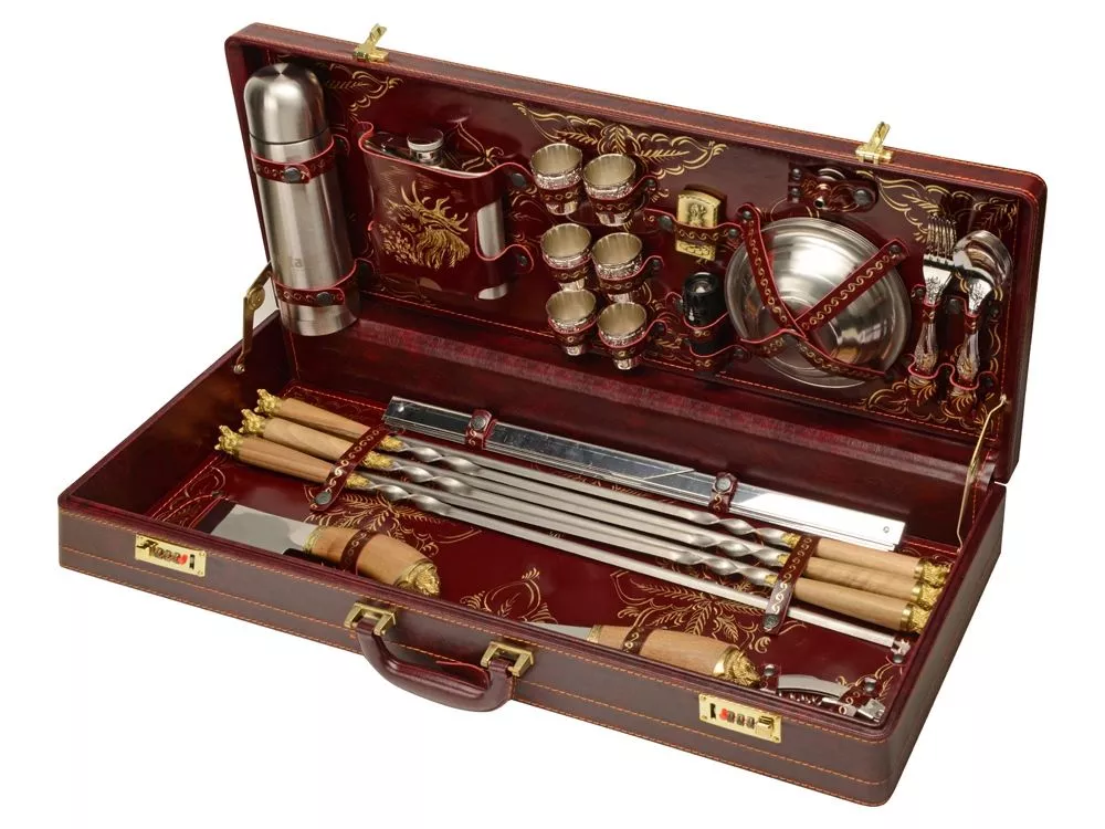 Кейс из сплит-кожи, с повышенной износостойкостью, внутренняя отделка натуральная кожа с художественным выжиганием. В комплект входит: Нож Тяпка 27,5 х 7 х 3 см - 1шт Нож 29 х 4,5 х 3 см - 1шт Штопор 11 х 3 х 1 см -1 шт Ножки для мангала 51 х 31 х 1 см - 2шт Шампур d2,5 х 68 см - 6шт Термос d7 х 24,5 см - 1шт Фляга 13 х 15 х 3см - 1шт Стопка d5,2 х 5 см - 6шт Зажигалка 4 х 1,3 х 6 см - 1шт Фонарик d3 х 9,5 см - 1шт Тарелка d16 х 4 см - 6шт Воронка d3,7 х 2,7 см - 1шт Ложка 19,3 х 4,5 х 3 см - 6шт Вилка 19,3 х 2,5 х 2 см - 6шт