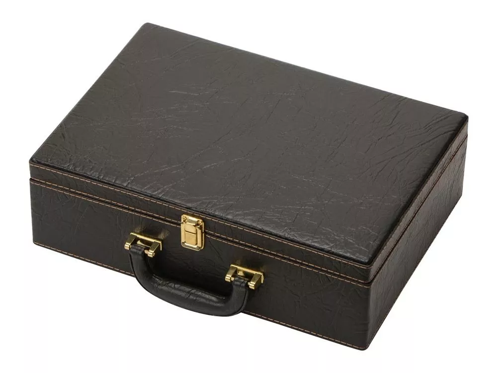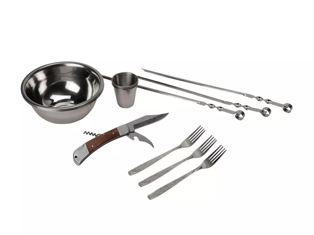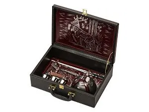 Кейс из сплит-кожи, с повышенной износостойкостью, внутренняя отделка натуральная кожа с художественным выжиганием. В комплекте: -стопка нерж. сталь 70мл- 3шт, -вилка столовая нерж. сталь- 3шт, -миска нерж. сталь 500 мл- 3шт, -шампура нерж. сталь 35 см- 3шт, -многофункиональный нож. Гравировка (оптоволоконный лазер) (Без чернения) на данный товар осуществляется бесплатно. Оплачивается только настройка оборудования в размере 950 рублей на весь тираж.