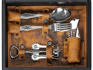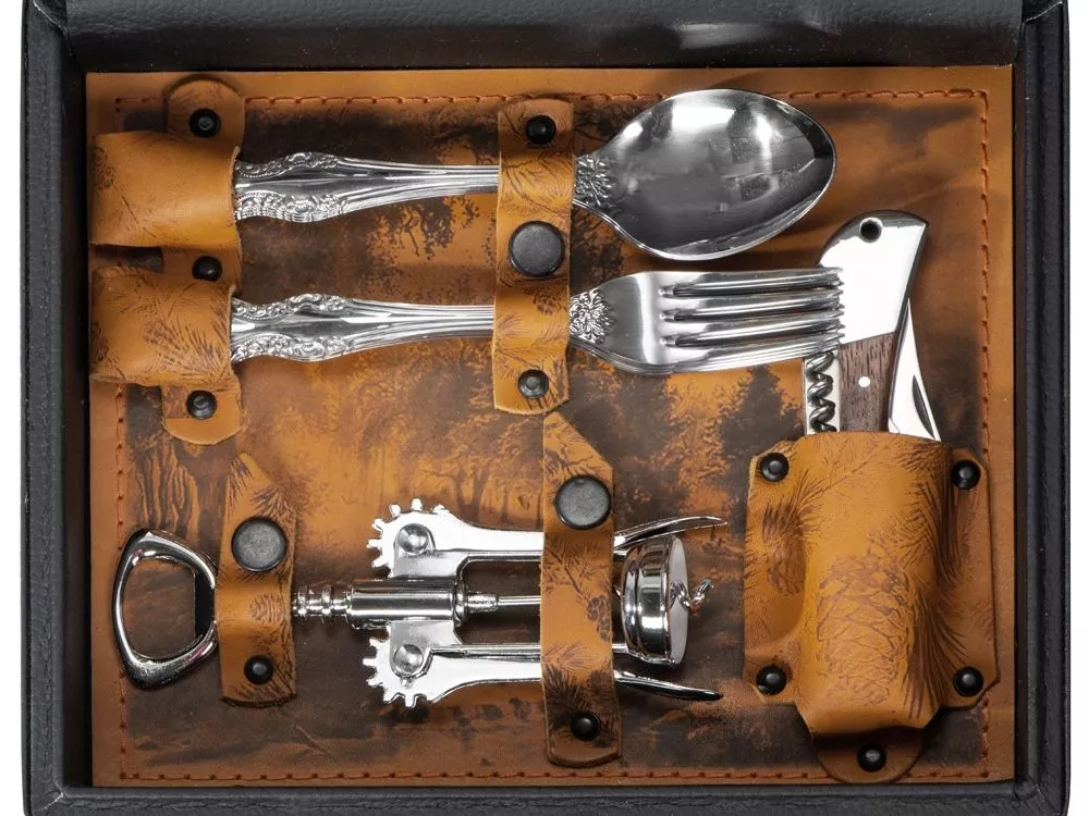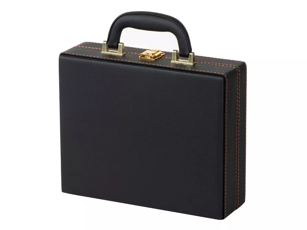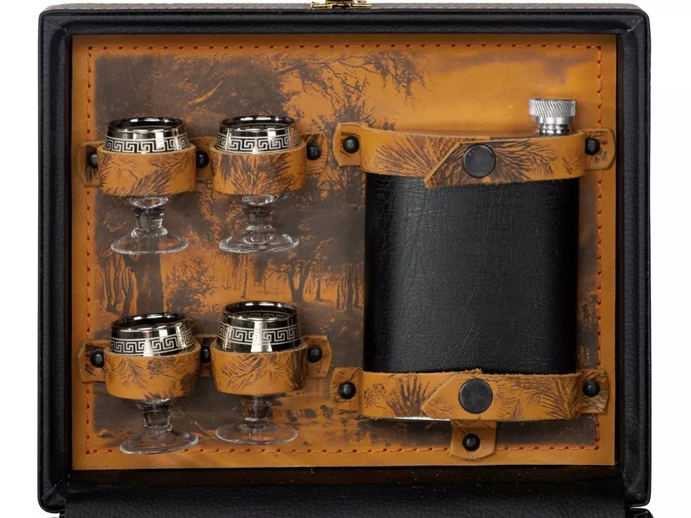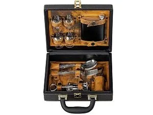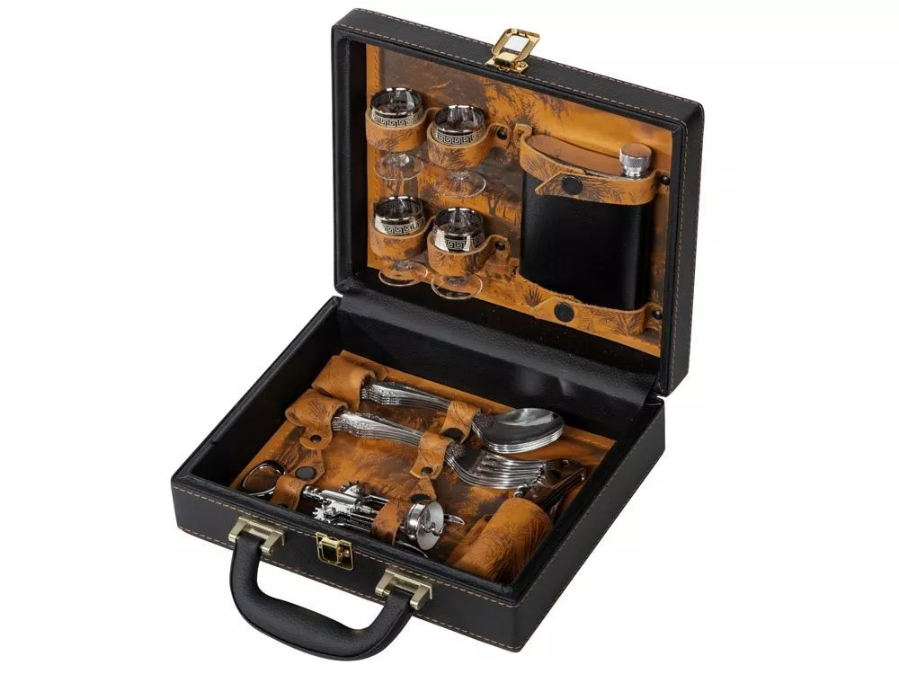 Кейс из сплит-кожи, с повышенной износостойкостью, внутренняя отделка натуральная кожа с художественным выжиганием. В комплект входит: - дипломат - стопка 30 мл - 4шт - фляга 250 мл - вилка - 4 шт - ложка - 4 шт - штопор - нож складной