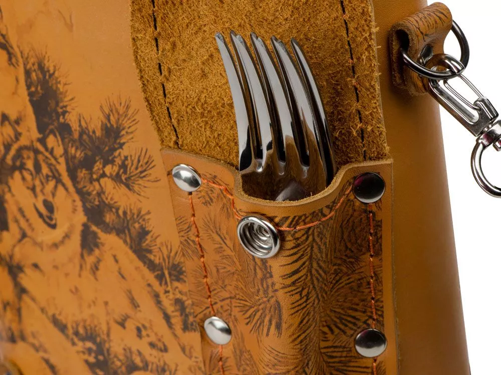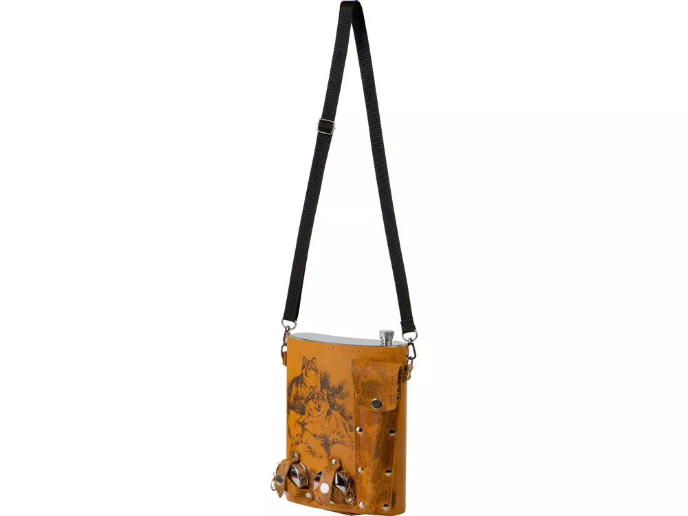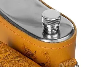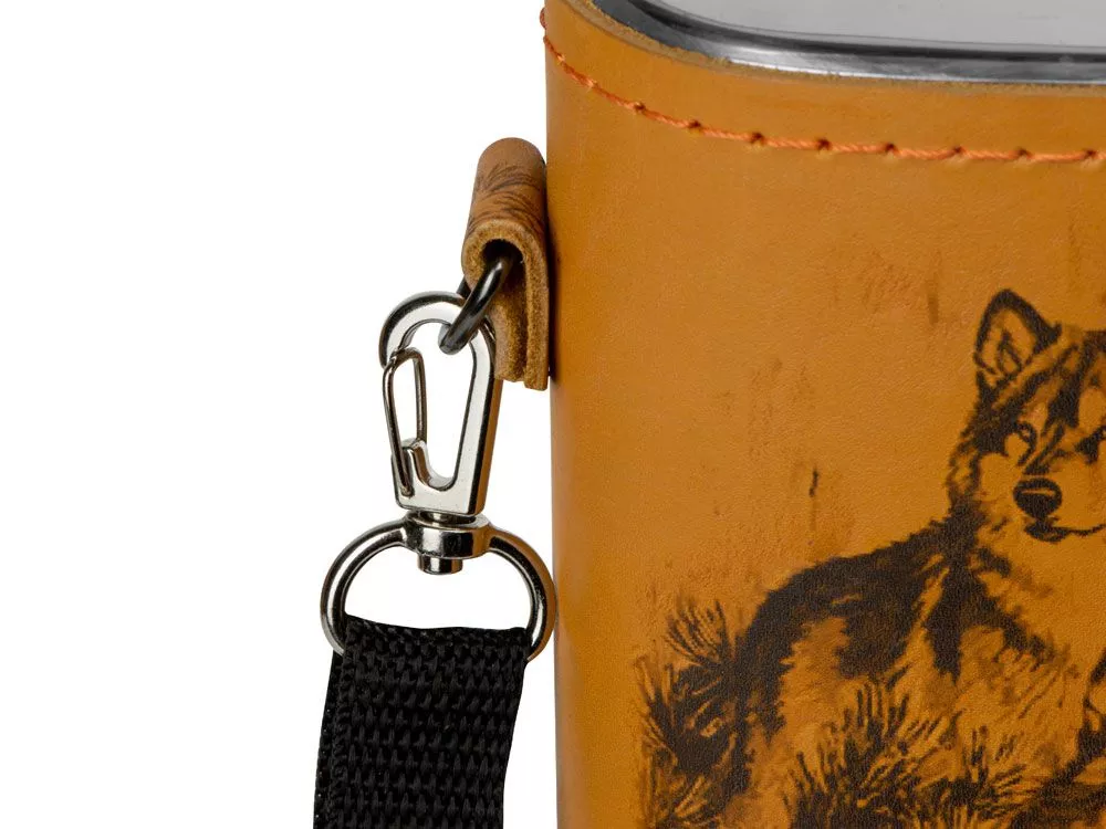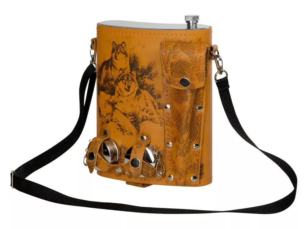 Фляга 2л в оплетке из натуральной кожи с нанесением рисунка методом художественного выжигания. Комплектация: - стаканчик складной – 2 шт - вилка (нерж.сталь) – 2 шт