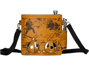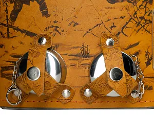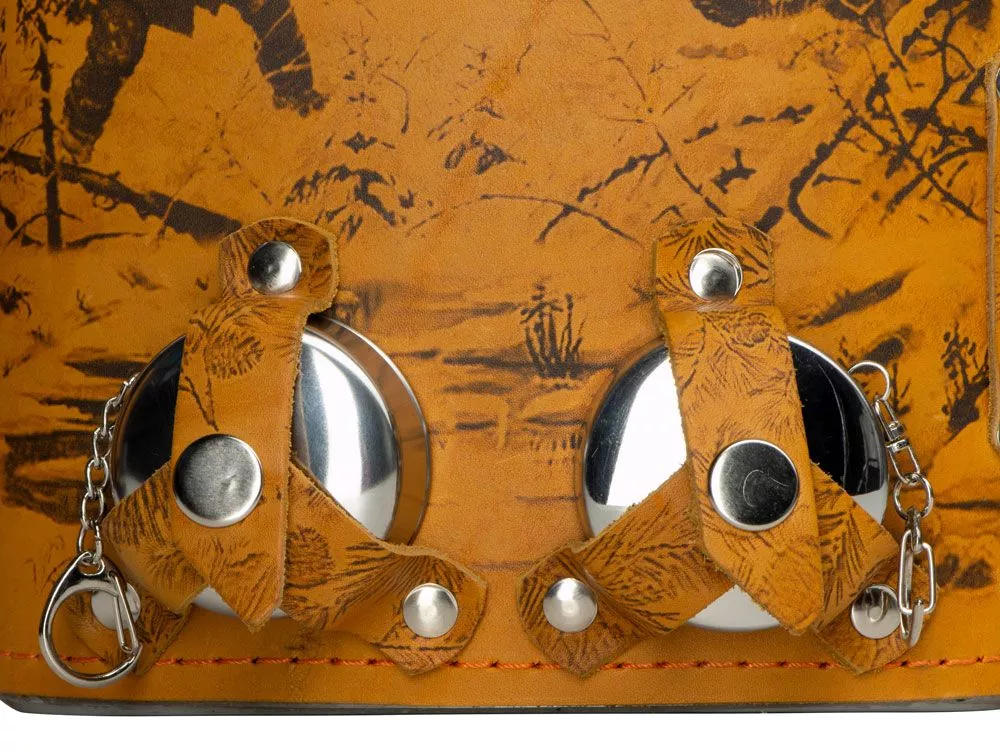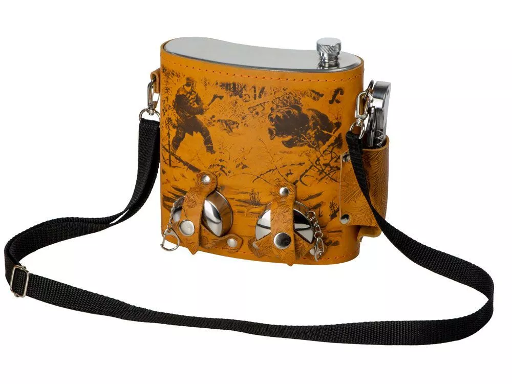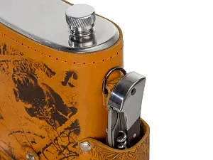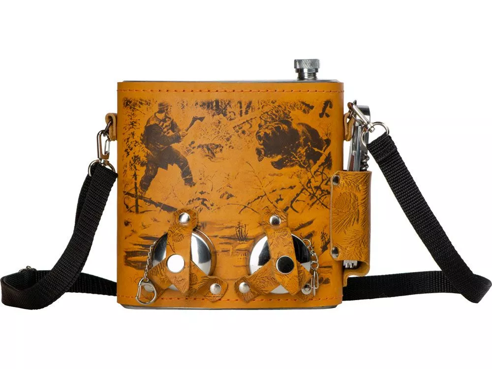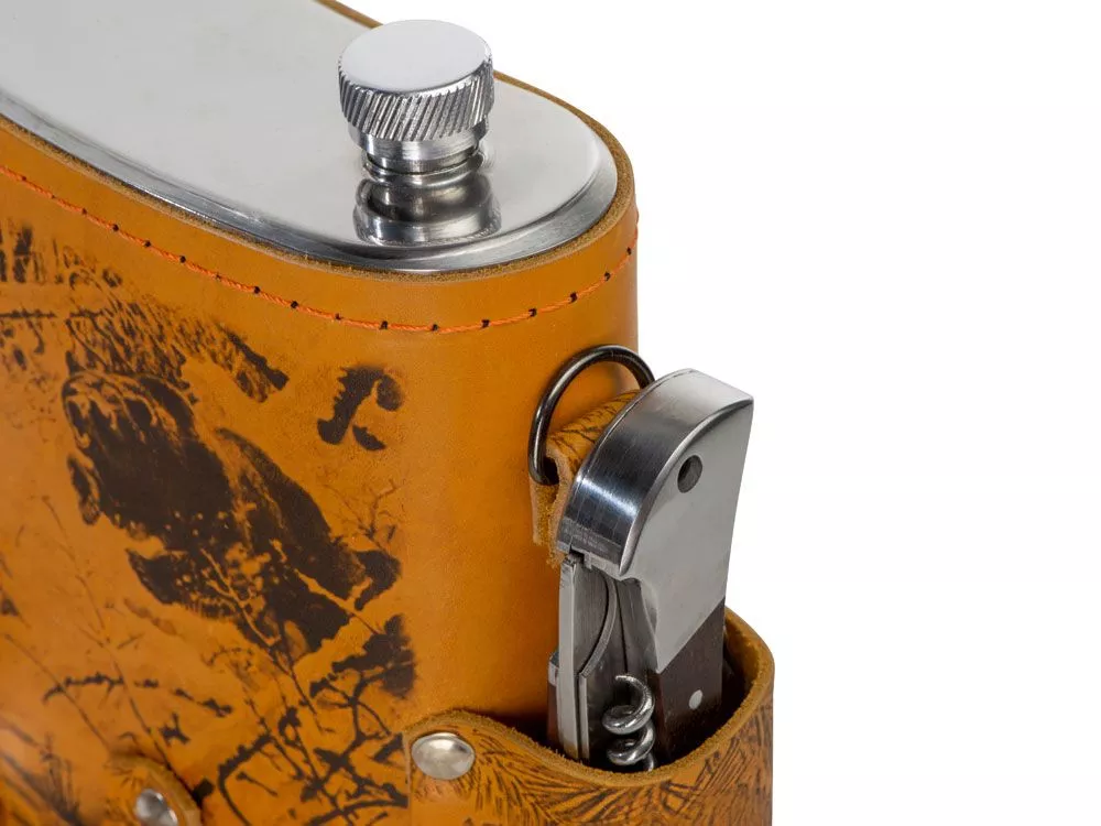 Фляга 1,5л в оплетке из натуральной кожи с нанесением рисунка методом художественного выжигания. Комплектация: - стаканчик складной – 2шт, - нож складной – 1шт