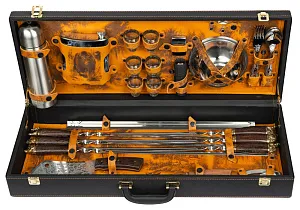 Кейс из сплит-кожи, с повышенной износостойкостью, внутренняя отделка натуральная кожа с художественным выжиганием. В комплект входит: Термос 0,5л - 1шт. Фляга 0,5л - 1 шт. Стопка 40мл - 6 шт. Зажигалка - 1 шт. Фонарик - 1 шт. Тарелка - 6 шт. Ложка - 6 шт. Вилка - 6 шт. Шампур - 6 шт. Нож Мясник - 1 шт. Нож - 1 шт. Воронка - 1 шт. Штопор - 1 шт. Мангал - 1 шт.