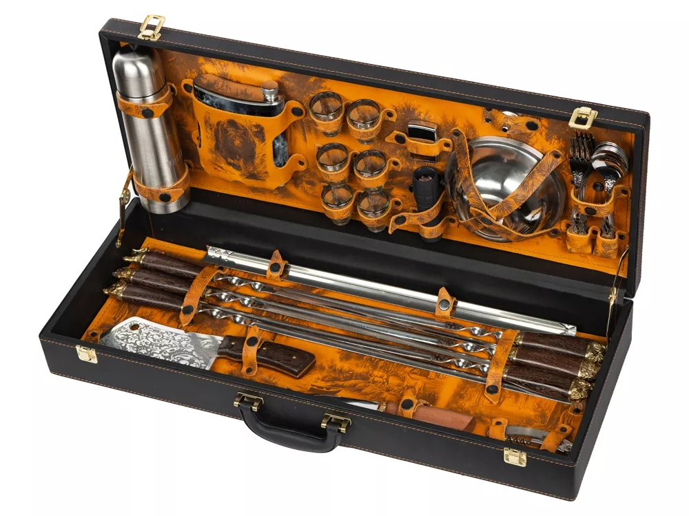 Кейс из сплит-кожи, с повышенной износостойкостью, внутренняя отделка натуральная кожа с художественным выжиганием. В комплект входит: Термос 0,5л - 1шт. Фляга 0,5л - 1 шт. Стопка 40мл - 6 шт. Зажигалка - 1 шт. Фонарик - 1 шт. Тарелка - 6 шт. Ложка - 6 шт. Вилка - 6 шт. Шампур - 6 шт. Нож Мясник - 1 шт. Нож - 1 шт. Воронка - 1 шт. Штопор - 1 шт. Мангал - 1 шт.