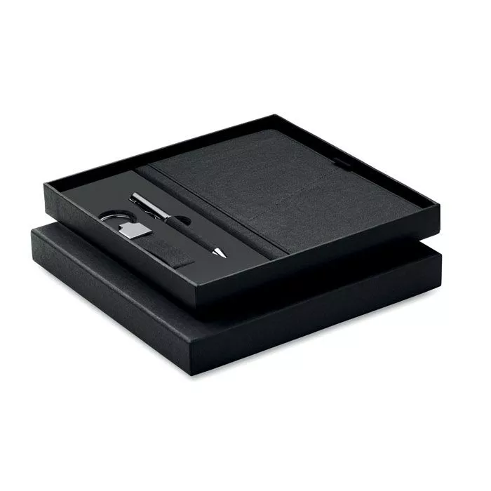Подарочный набор из 3 предметов. В набор входят металлическая шариковая ручка со вставками из переработанного полиэстера, блокнот в твердой обложке RPET с передним карманом для смартфона и брелок для ключей из полиэстера RPET. Синие чернила.
