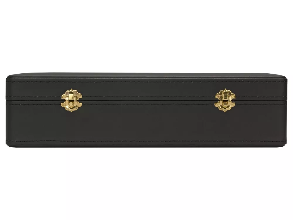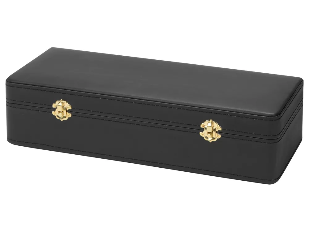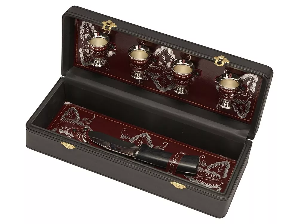 Шкатулка-футляр - хороший подарок, особенно, если в ней достойное содержание. Например, набор рюмок на 4 персоны и нож для закуски. Отдельно такой набор дарить не солидно - не красиво преподносить стопки без упаковки, а пустая шкатулка только разочарует - открывая такую красоту, всегда ждешь внутри что-то чудесное. Подарочную шкатулку приятно поставить в сервант или спрятать в ящик рабочего стола, такой вещью хочется похвалиться друзьям и угостить из нее чем-нибудь вкусненьким, показывая посетителям свой статус и любовь к хорошим вещам. В комплекте: Футляр искусственная кожа -1 шт. Нож Универсал (нерж.сталь 40 х 13 55 HRC), рукоять орех – 1 шт. Стопка 30 мл (нейзильбер) – 4 шт.