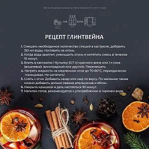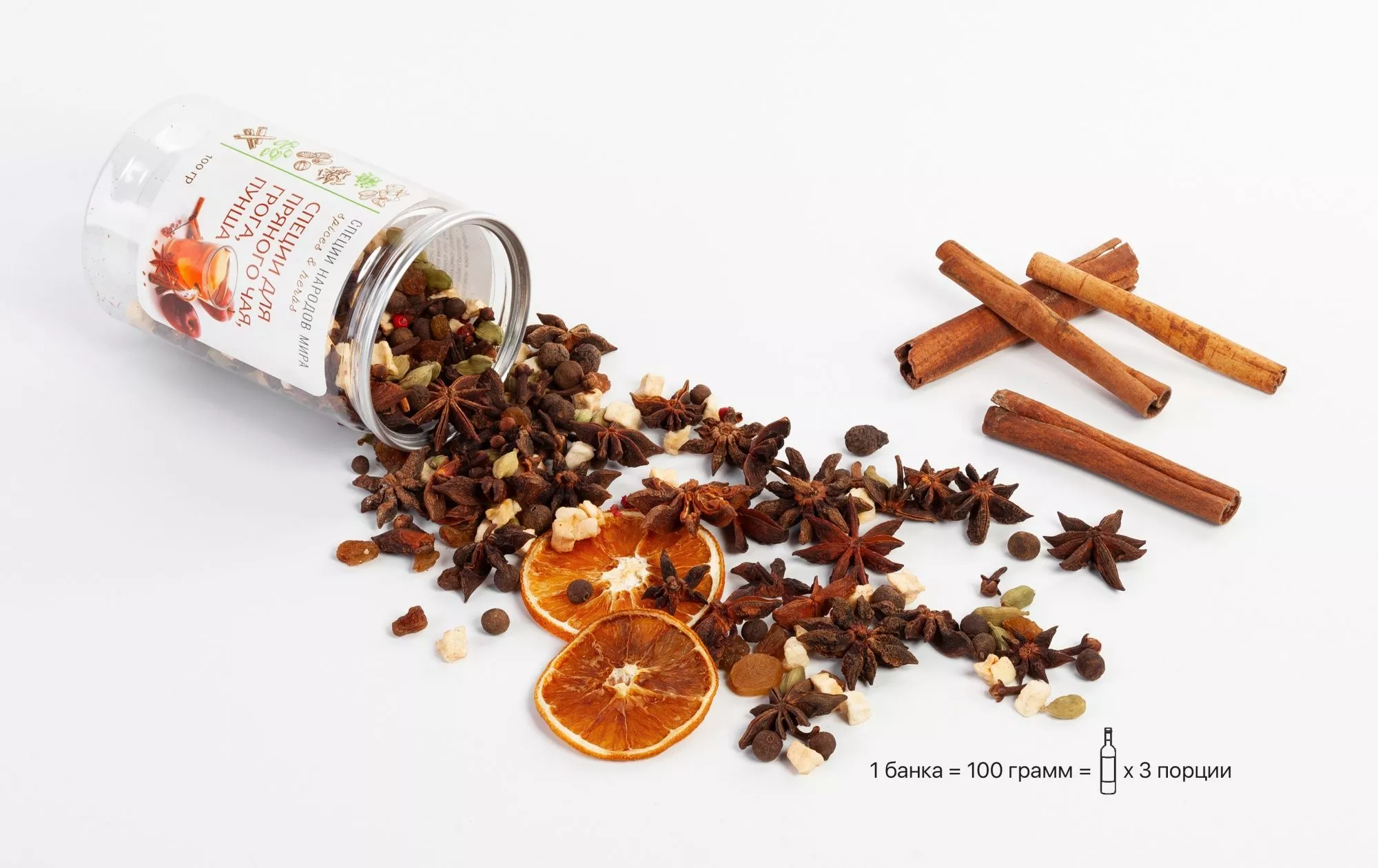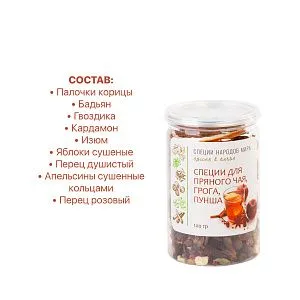 - специи для глинтвейна, пряного чая, пунша, грога 100 гр (3 порции: палочки корицы, бадьян, гвоздика, кардамон, изюм, яблоки сушеные, перец душистый, апельсины сушеные кольцами, перец розовый); h 11 х d 7 см;