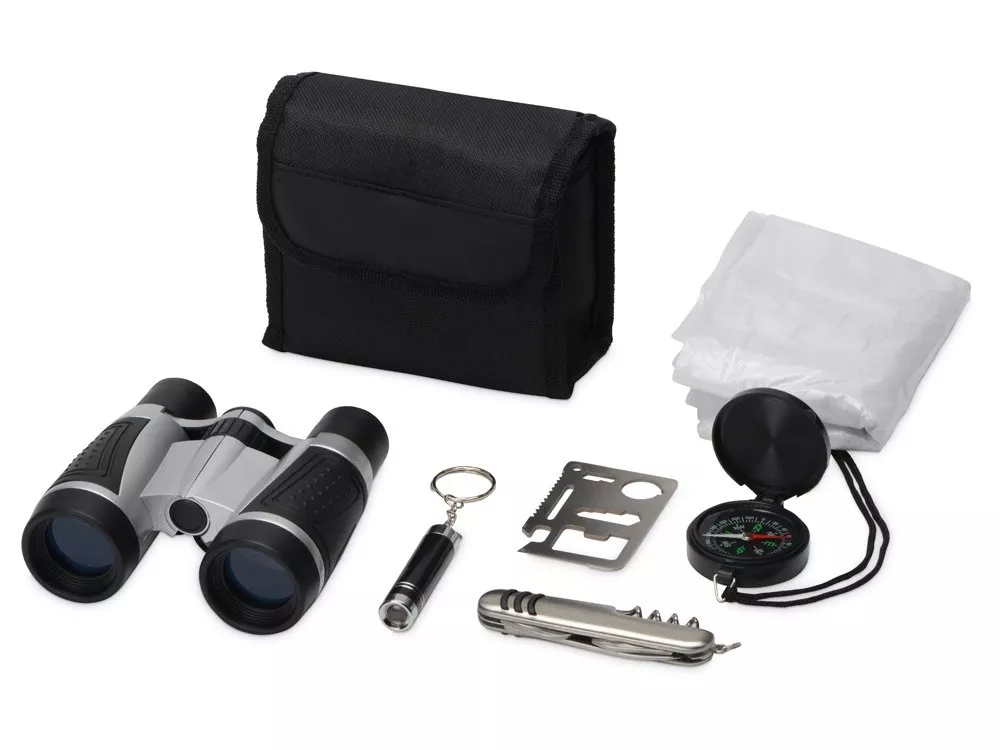 Набор Турист - отличный подарок для увлеченных пешими путешествиями людей. Набор путешественника пригодится для обычных прогулок, охоты, рыбалки и туристических приключений на природе. Состоит из бинокля 5х21 с салфеткой, мультитула, мультиинструмента в форме карточки, компактного фонарика, компаса и дождевика. Поставляется в черном чехле на липучке. Фонарик работает на 3 батарейках формата LR44. Батарейки входит в комплект. Гравировка (Без чернения) на данный товар осуществляется бесплатно. Оплачивается только настройка оборудования в размере 500 рублей на весь тираж.