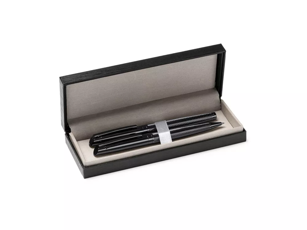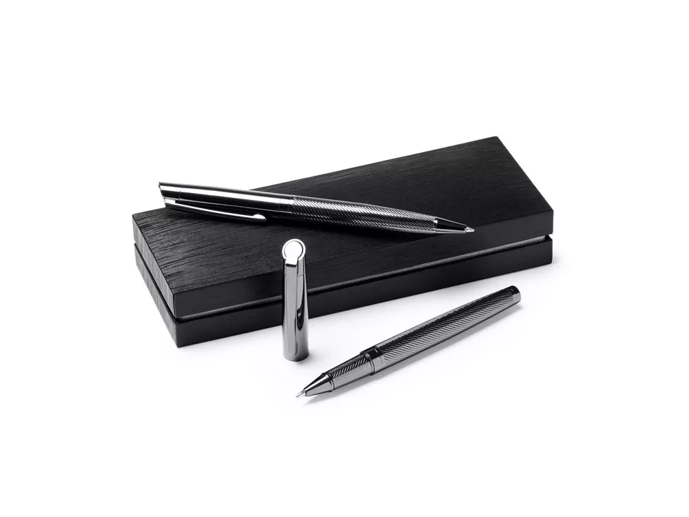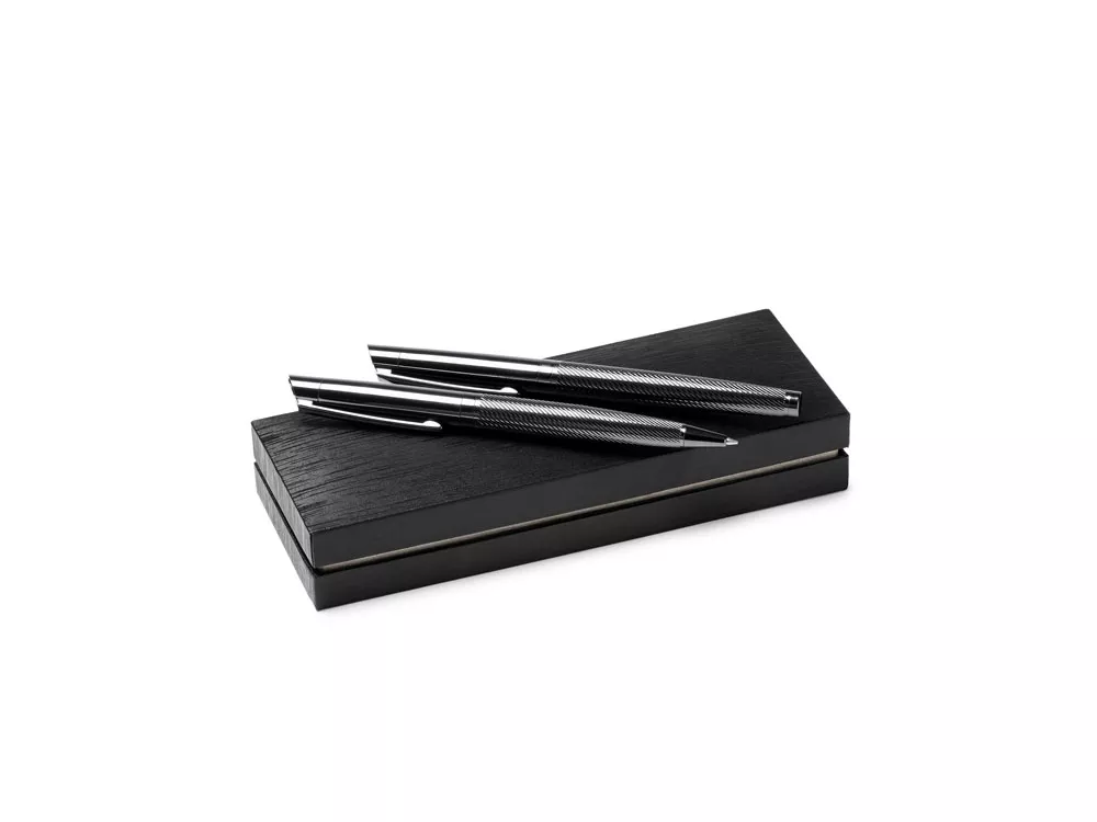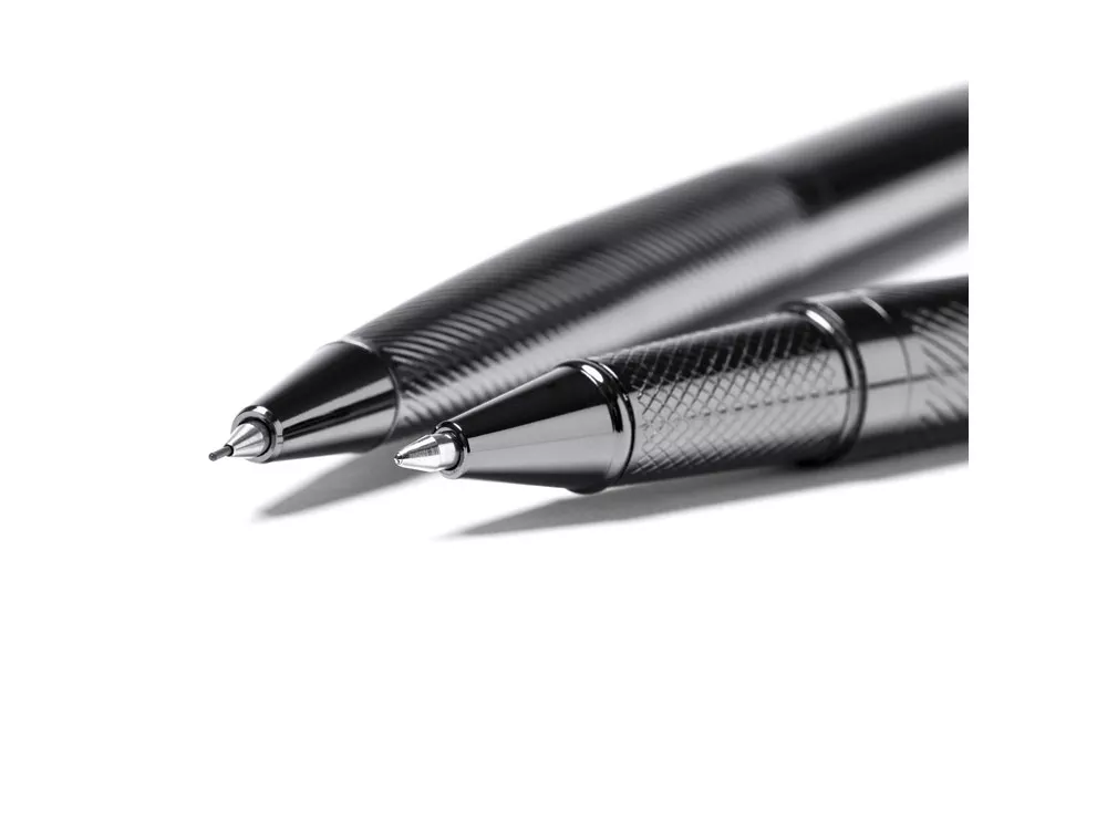 Элегантный набор, состоящий из ручки роллера и механического карандаша. Изготовлен из металла с затемненным рисунком. Поставляется в мягком футляре из кожзаменителя с внутренней подкладкой.