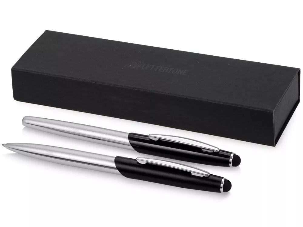 Набор состоит из 2-х ручек со стилусами: шариковой и роллера. Изящная шариковая ручка-стилус и ручка-роллер с матовой верхней частью и блестящей хромированной нижней частью и соответствующими хромированными вставками. Набор ручек Roma будет отличным деловым подарком к любому празднику. Гравировка (оптоволоконный лазер) (Без чернения) на данный товар осуществляется бесплатно. Оплачивается только настройка оборудования в размере 950 рублей на весь тираж.