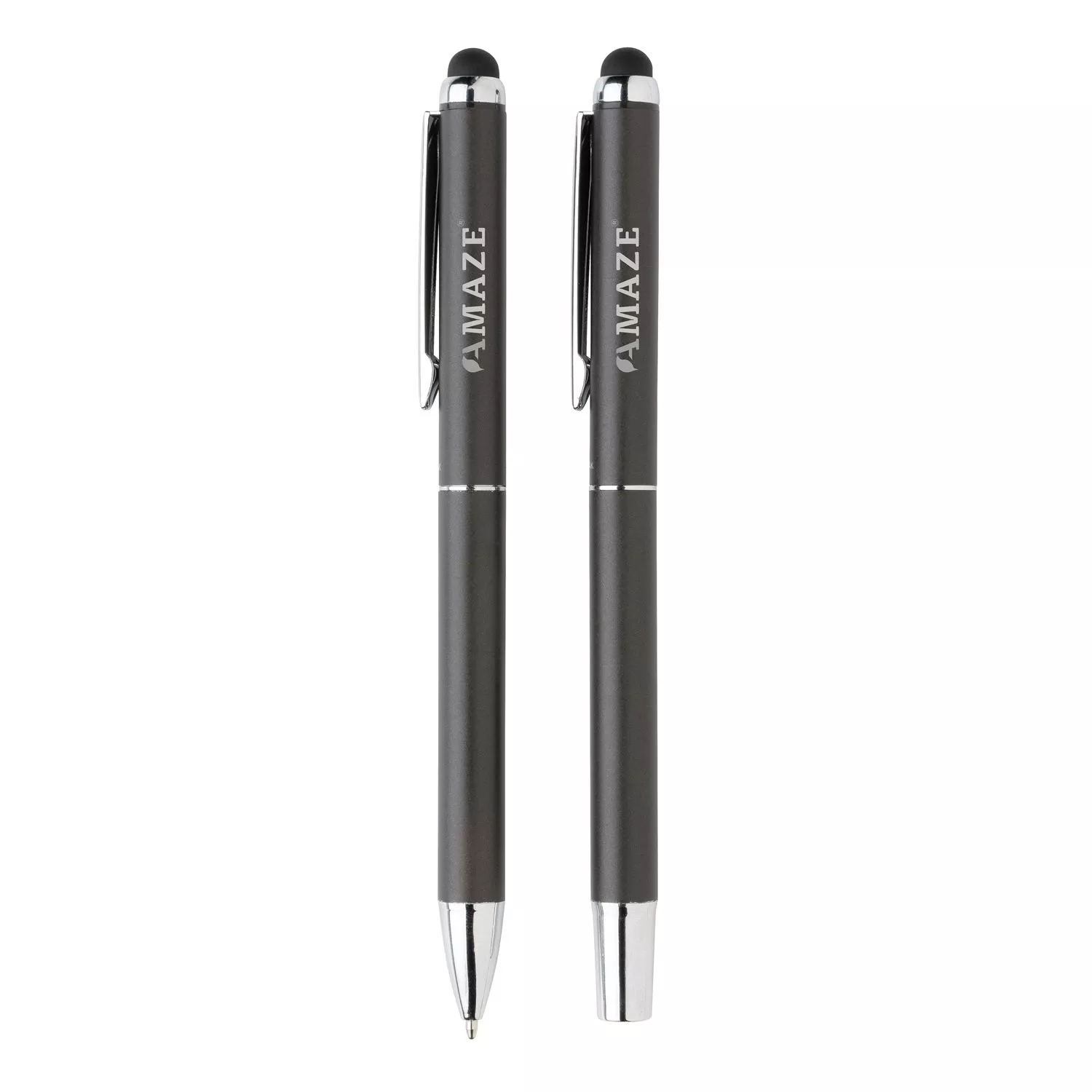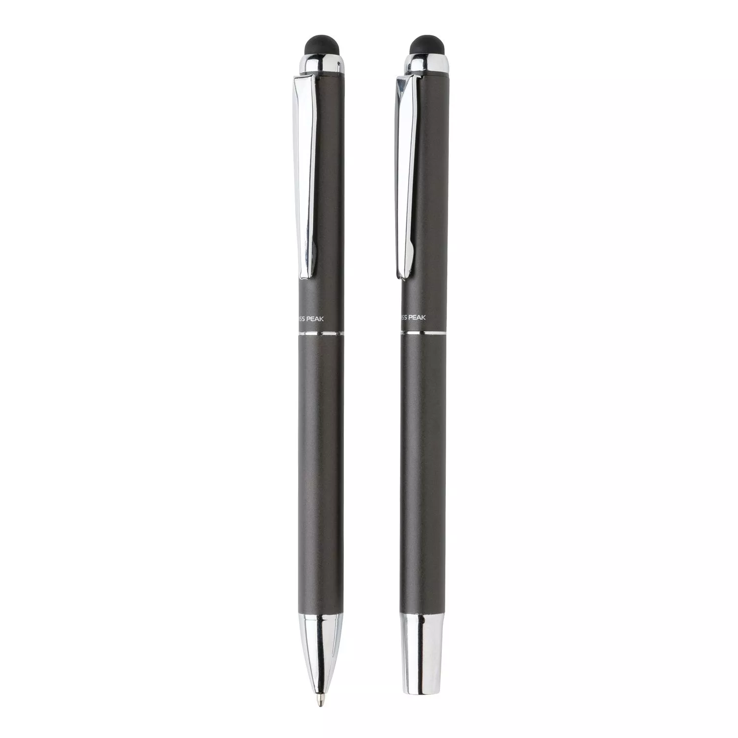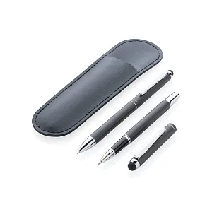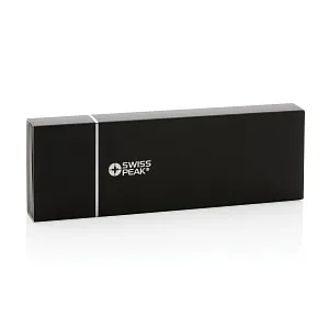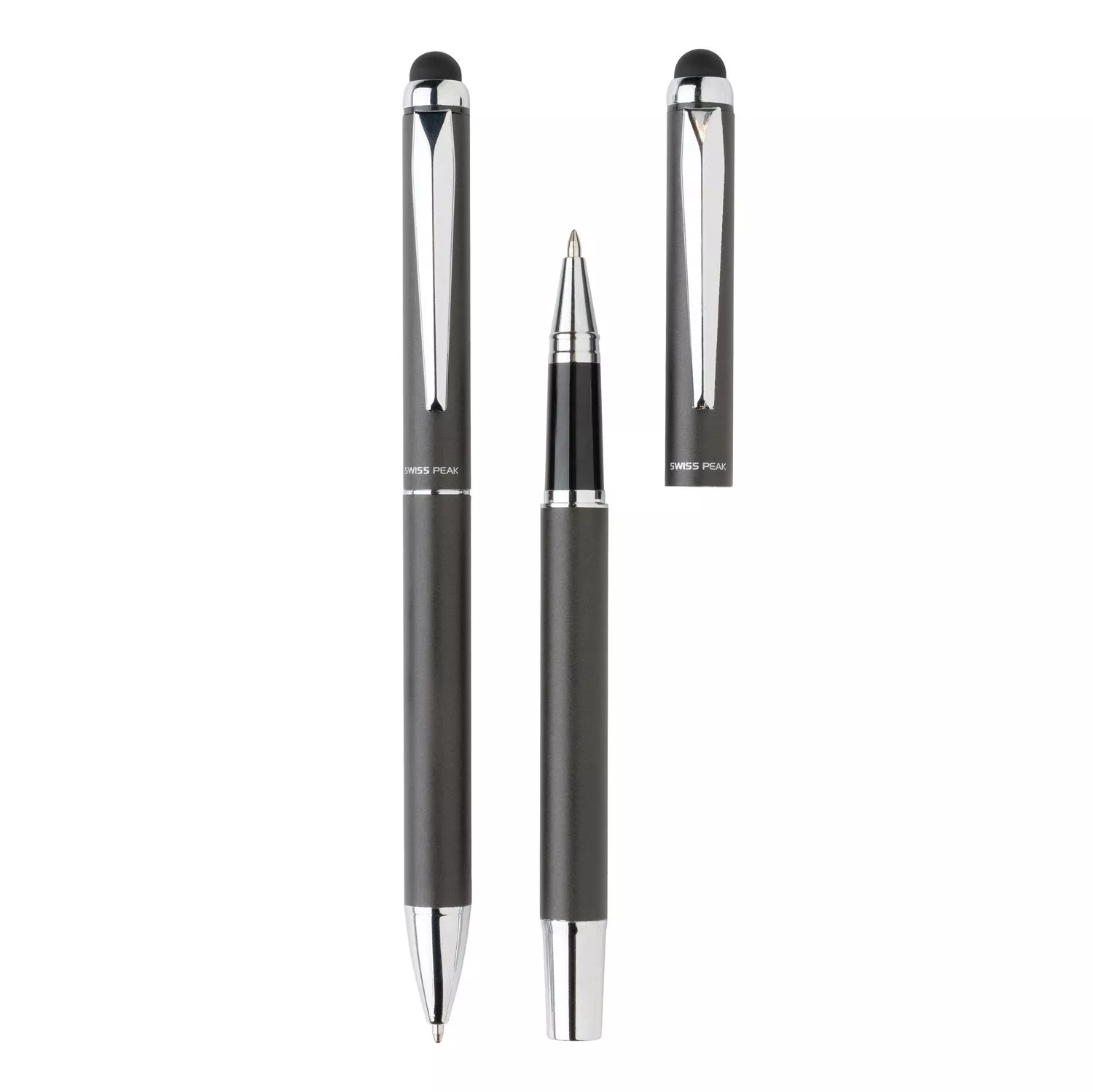 Роскошный набор от Swiss Peak включает в себя шариковую ручку и ручку-роллер. Матовый алюминиевый корпус с серебристым глянцевым клипом. Обе ручки заправлены немецкими чернилами Dokumental синего цвета. Длина письма для шариковой ручки — 1200 м, для ручки-роллера — 400 м. Набор поставляется с чехлом из полиуретана и фирменной черной коробкой.