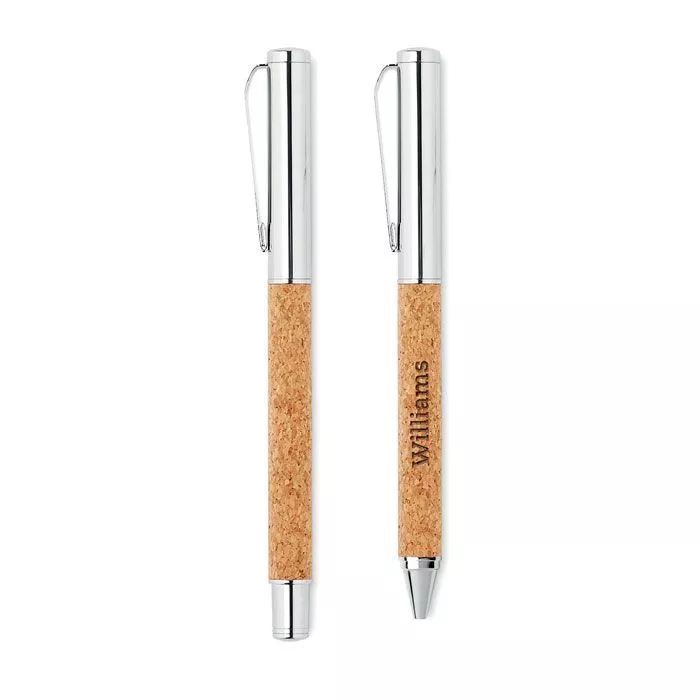 Набор металлических ручек. Шариковая и роллер с пробковым корпусом. Представлен также в пробковой коробке. Синие и черные чернила.