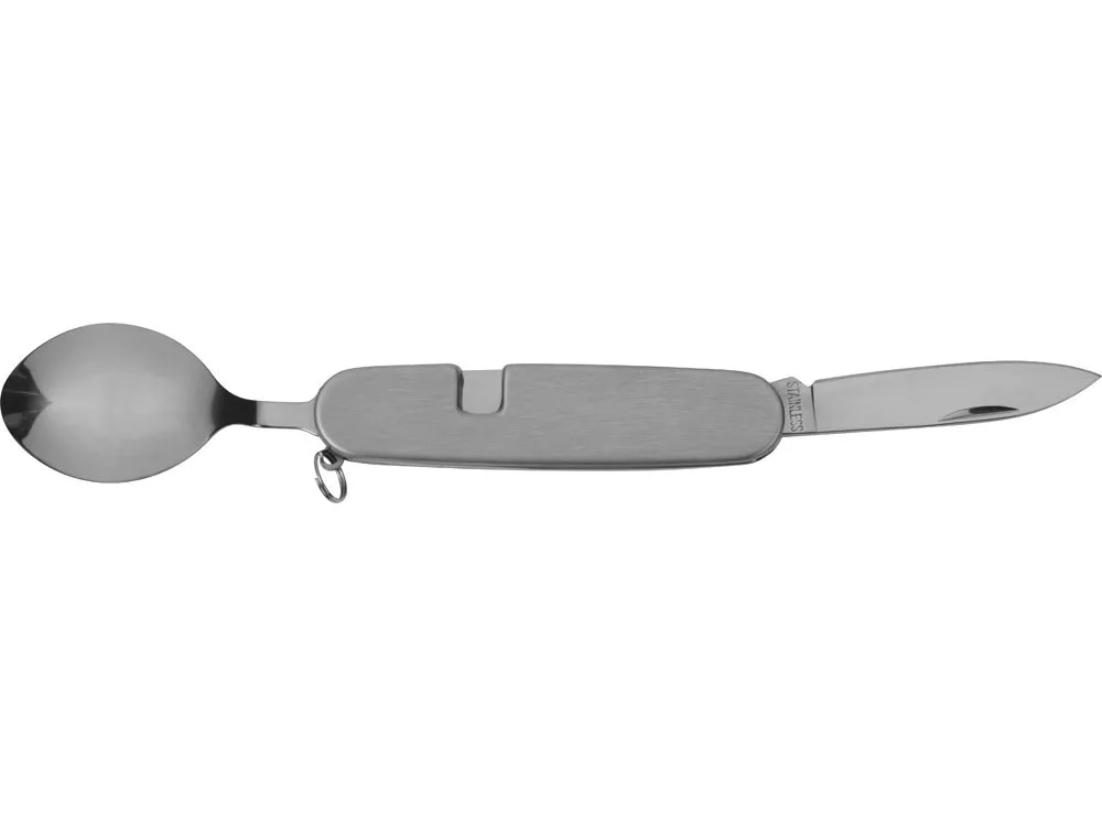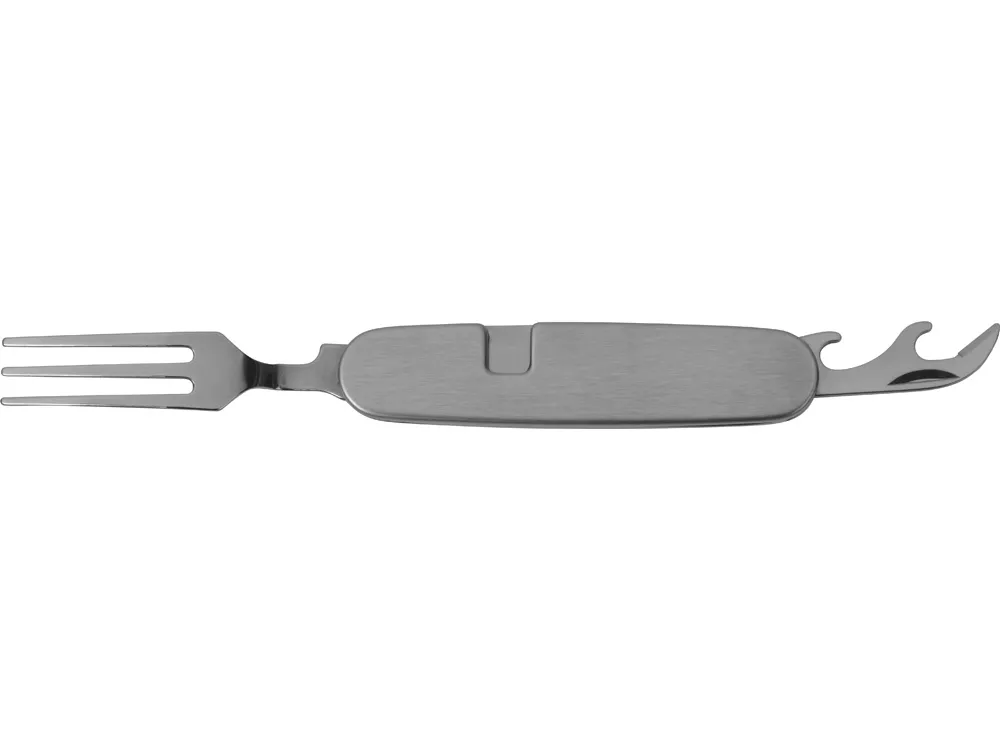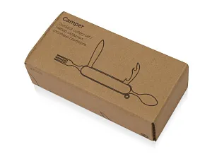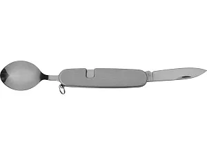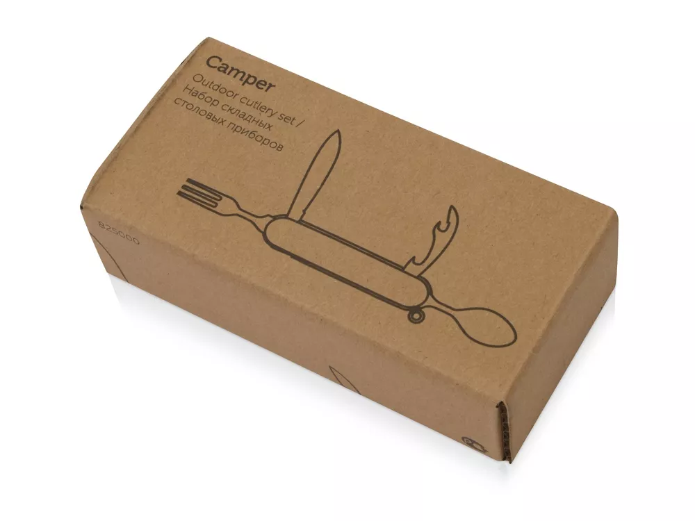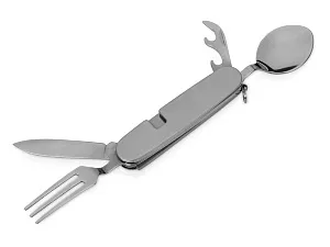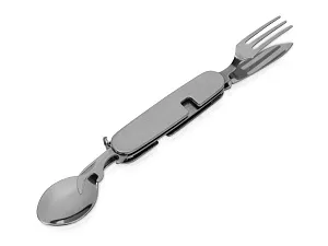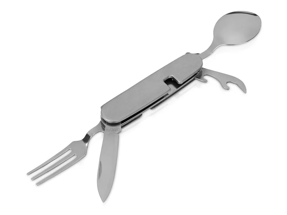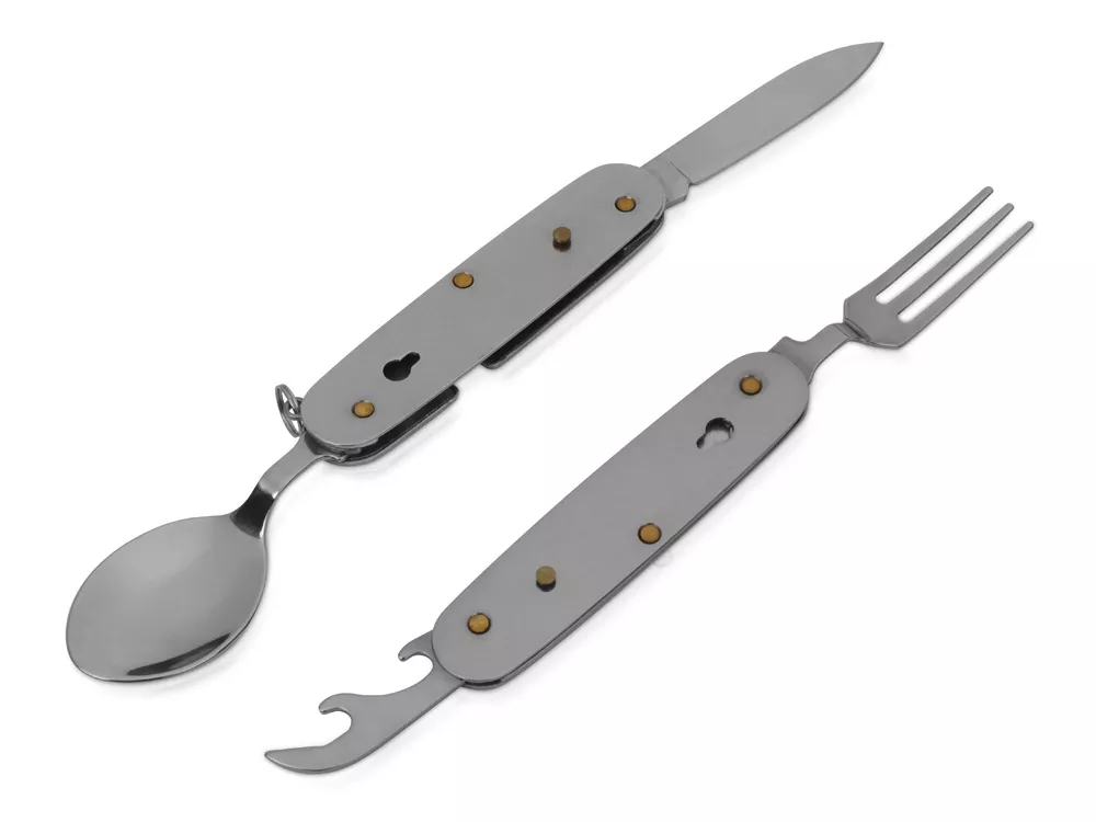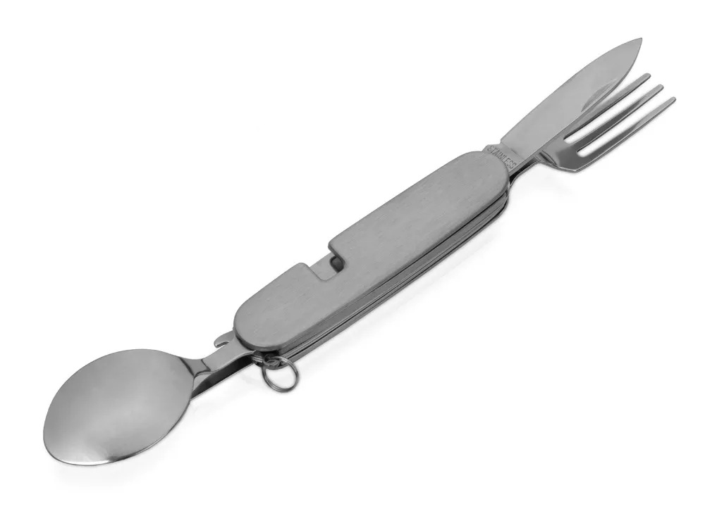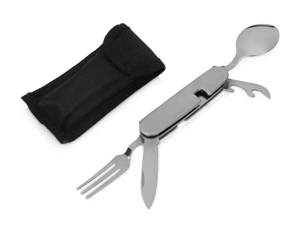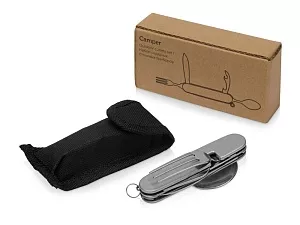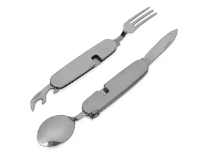 Незаменимая вещь любителя экстремальных путешествий и активного отдыха на природе - набор складных столовых приборов. В нем есть все, что необходимо - ложка, вилка, ножик, открывалка бутылок и жестяных банок. Также имеется удобное кольцо для подвешивания. Набор разделяется на две части. Столовые приборы поставляются в черном защитном чехле, который обеспечит их сохранность и чистоту. Гравировка (Без чернения) на данный товар осуществляется бесплатно. Оплачивается только настройка оборудования в размере 500 рублей на весь тираж.