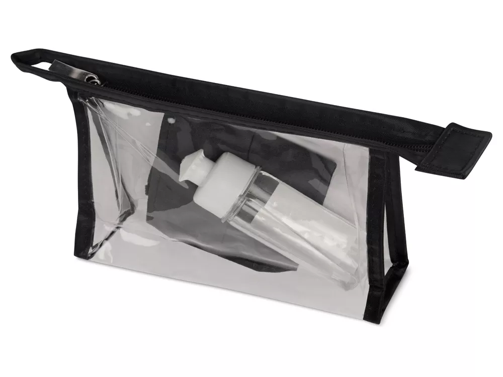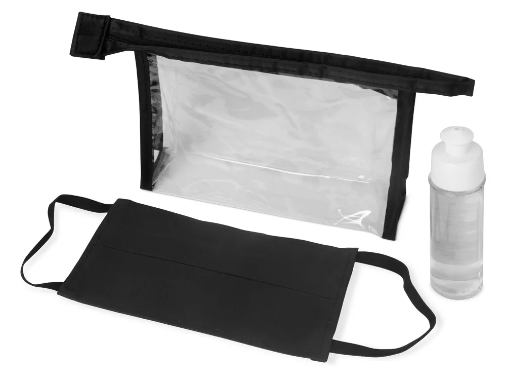 Самое необходимое всегда под рукой - в любом месте и при любой ситуации. Многоразовая хлопковая маска черного цвета и антисептик в стильной пластиковой косметичке поместятся в любой сумке.