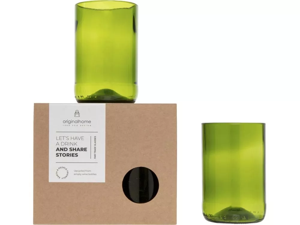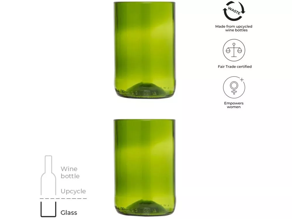Набор из двух бокалов объемом 280 мл, изготовленных из переработанных винных бутылок. Эти стаканы идеально подходят для любого напитка, что делает их идеальными вариантом как для повседневного использования, так и для особых случаев. Поставляется в подарочной коробке. Переработанное стекло.