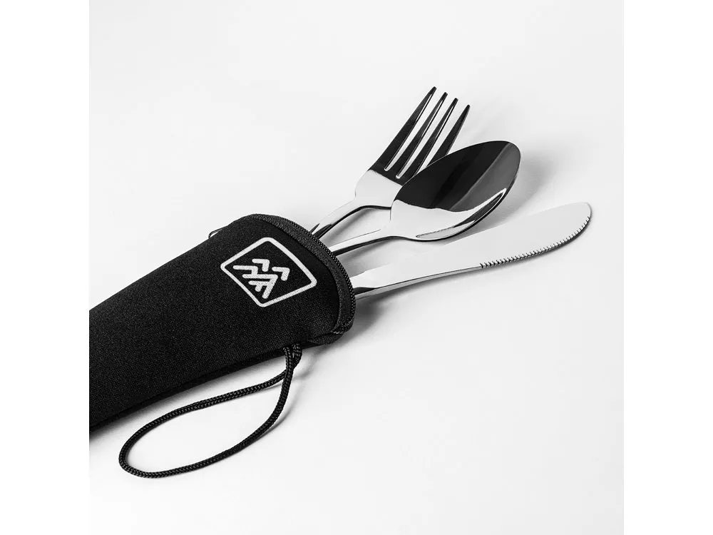Набор столовых приборов из нержавеющей стали в практичном неопреновом футляре. Включает в себя вилку, нож и ложку, идеально подходящие для того, чтобы брать их с собой куда угодно.