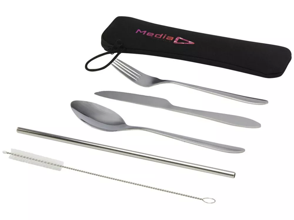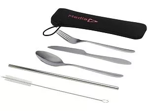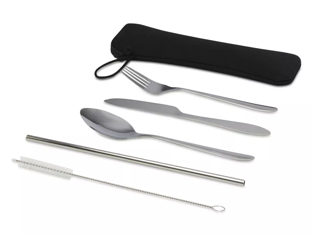 Набор столовых приборов Sheen включает вилку, нож, ложку, многоразовую соломинку и щёточку для её очистки. Все элементы выполнены из прочной и легко моющейся нержавеющей стали. Комплект удобно хранить и переносить в прочном чехле из неопрена с удобной петлей.