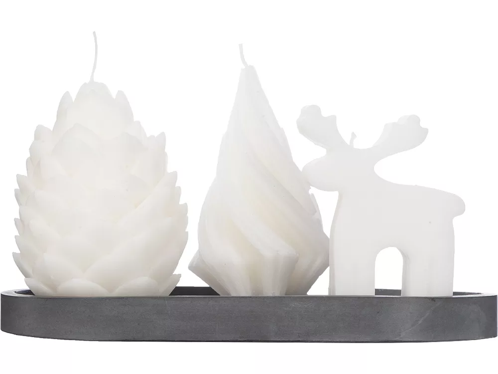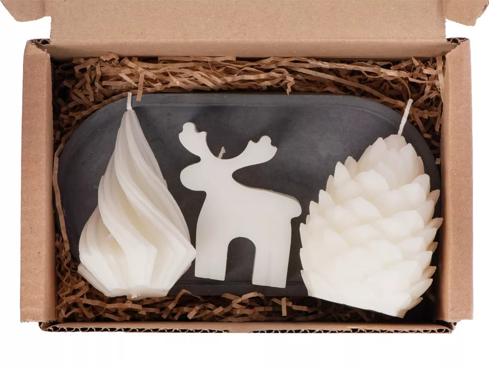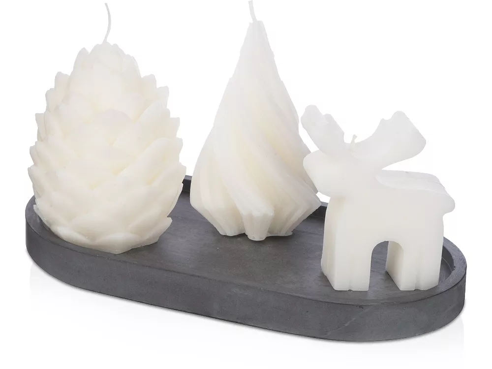 Этот набор свечей подарит вам новогоднее настроение и станет стильным украшением интерьера к любимому всеми с детства празднику. В набор входят три свечи на подставке — неотъемлемые символы Нового года и Рождества - это сосновая шишка, рождественский олень и, конечно же, елка, как главный символ нового года! Все три свечки выполнены в едином молочном оттенке, а подставка, изготовленная из смеси гипса и бетона - графитовая серая. После того, как прогорят все свечи, подставку можно использовать для организации на рабочем столе, как подставку для пало санто или других благовоний, или даже для хранения бижутерии. • Милый новогодний дизайн • Многофункциональная подставка из гипсобетона • Готовая идея новогоднего подарка Тампопечать (1 цвет (цветные изделия)) на данный товар осуществляется бесплатно. Оплачивается только настройка оборудования в размере 4000 рублей на весь тираж.