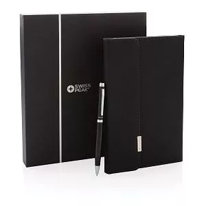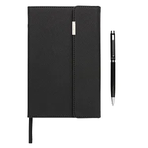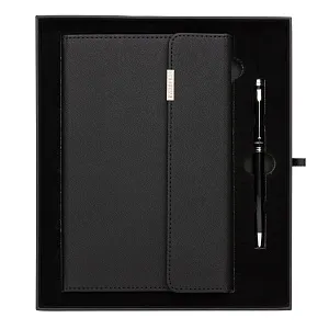 Этот набор идеально подойдет тем, кто хочет выглядеть в офисе утонченно. Обложка блокнота выполнена из текстурированного PU с металлическим лого, внутри 80 листов (160 страниц) линованной кремовой бумаги плотностью 80 г/м². Ручка заправлена немецкими чернилами, способна прочертить линию длиной до 1200 метров. Набор упакован в роскошную подарочную коробку.