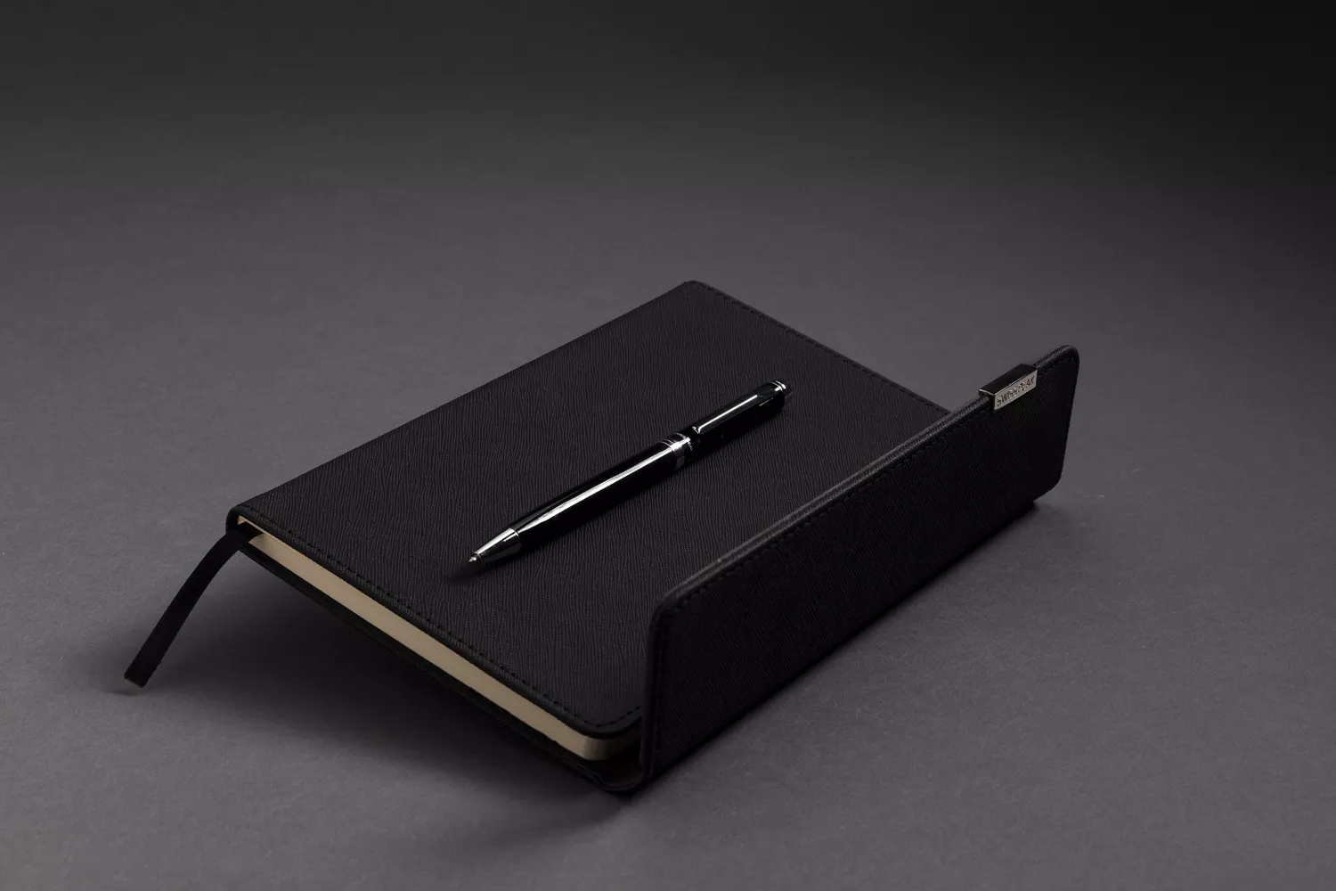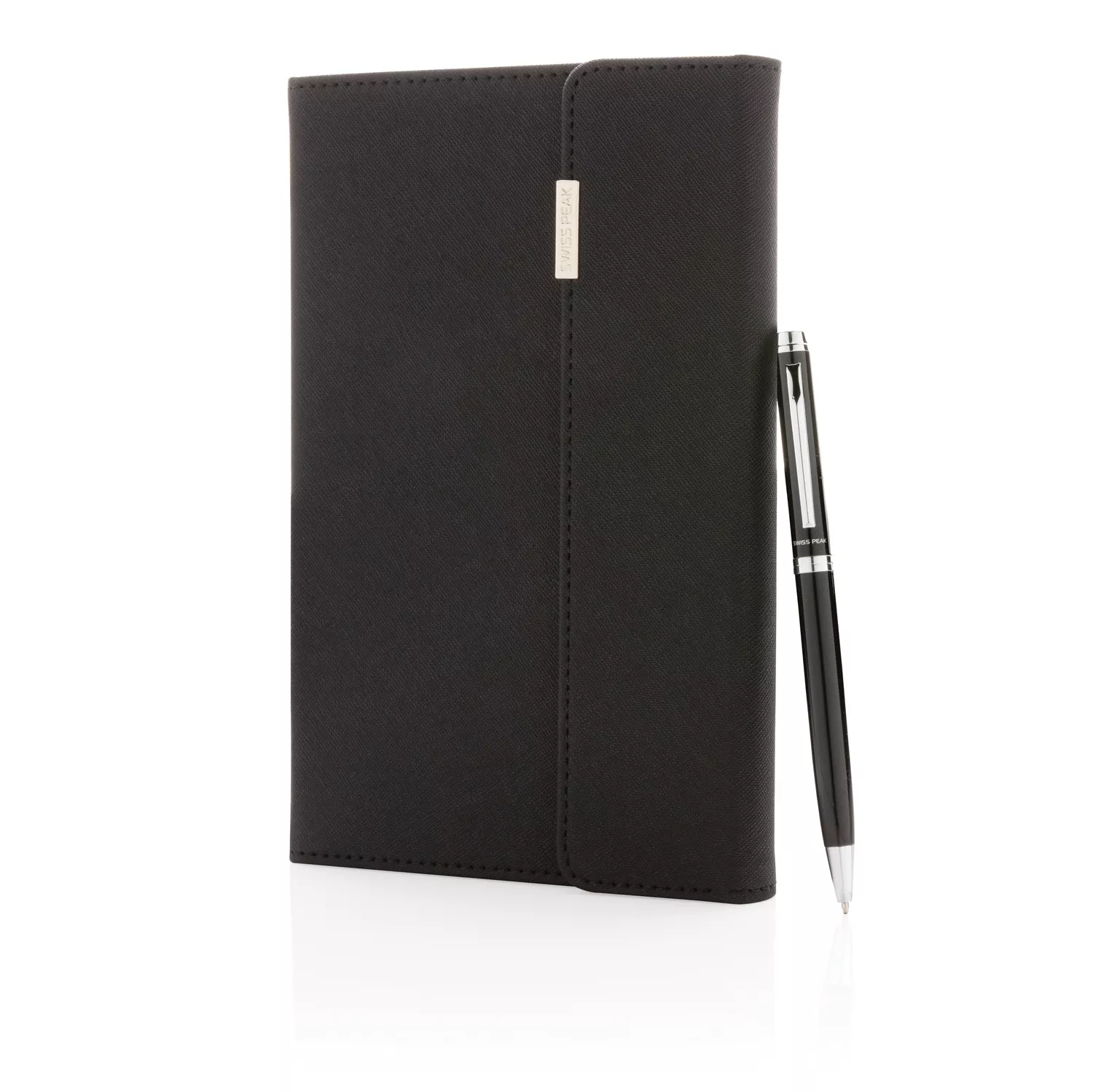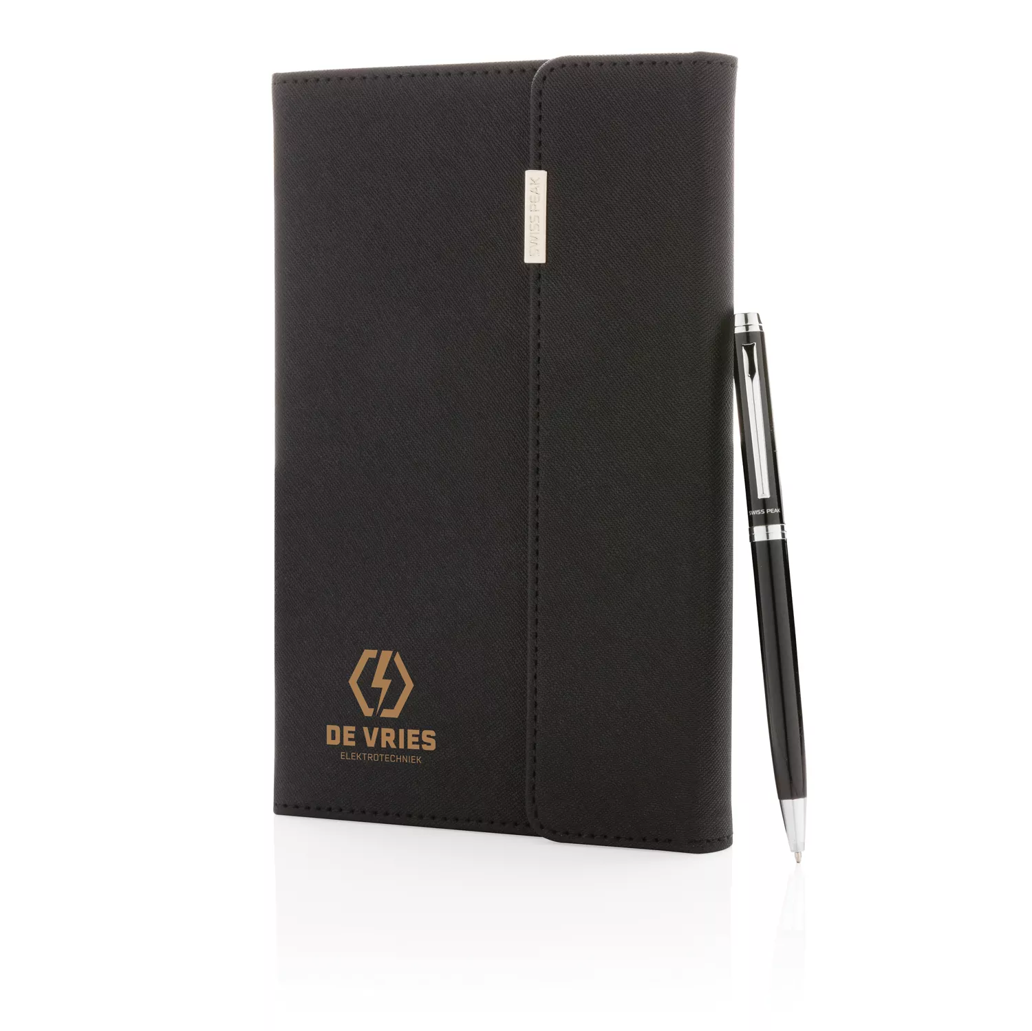 Этот набор идеально подойдет тем, кто хочет выглядеть в офисе утонченно. Обложка блокнота выполнена из текстурированного PU с металлическим лого, внутри 80 листов (160 страниц) линованной кремовой бумаги плотностью 80 г/м². Ручка заправлена немецкими чернилами, способна прочертить линию длиной до 1200 метров. Набор упакован в роскошную подарочную коробку.